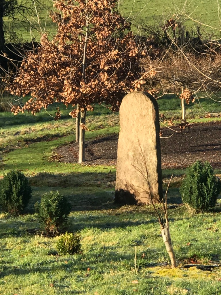 On St Stephen’s Day, aided by two pandemically rusticated students in our family, the placing-manoeuvre was duly accomplished, just as planned, and I’m glad to say without mishap. We then re-used the rounded ‘stob’ to pack the excavated earth and small water-worn pebbles around the base of the stone. Within a few days it stood safe, firm and solid. I was content. After all, as the Manitou driver had said, ‘it’s not as if any cattle are going to rub up against it’.