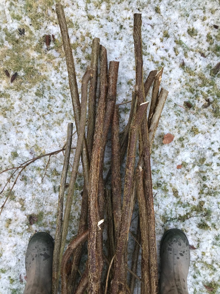 The longest and straightest stems are destined to form two wigwams in the kitchen garden. If my skills allow, they will give elegant height and a sense of order in the raised beds. When the snow and ice are long gone, I hope these hazel poles will support fresh green legumes – to grace a summer lunch.