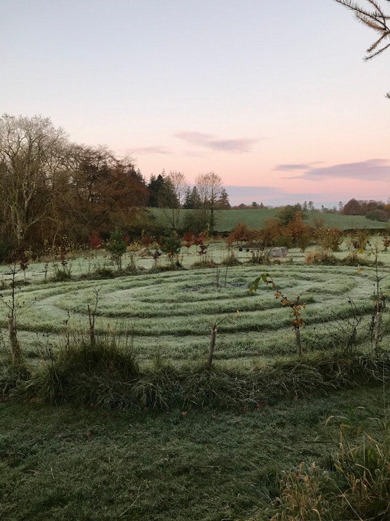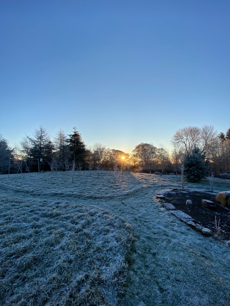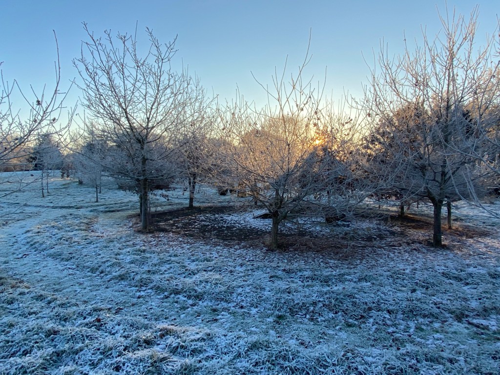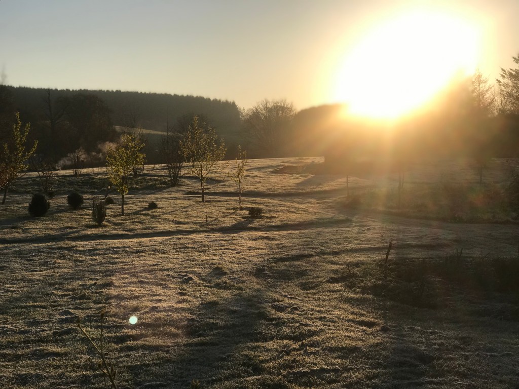 As I walked out from the house for the early morning dog walk, the half-moon was still sitting white in the clear southern sky. Then turning towards the garden I stepped into a bank of cold air.