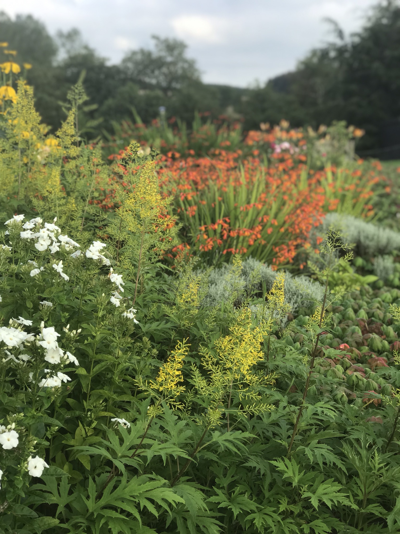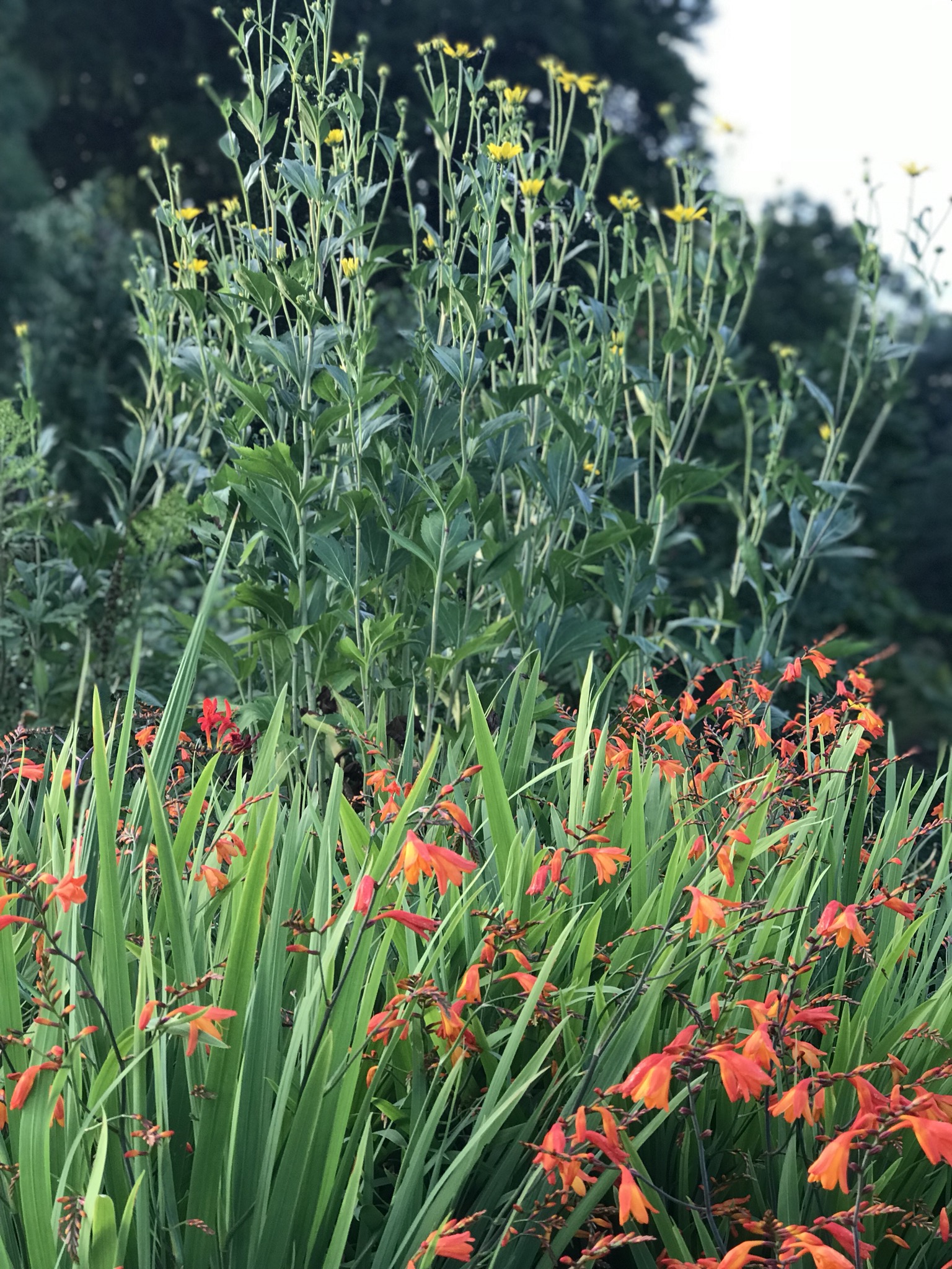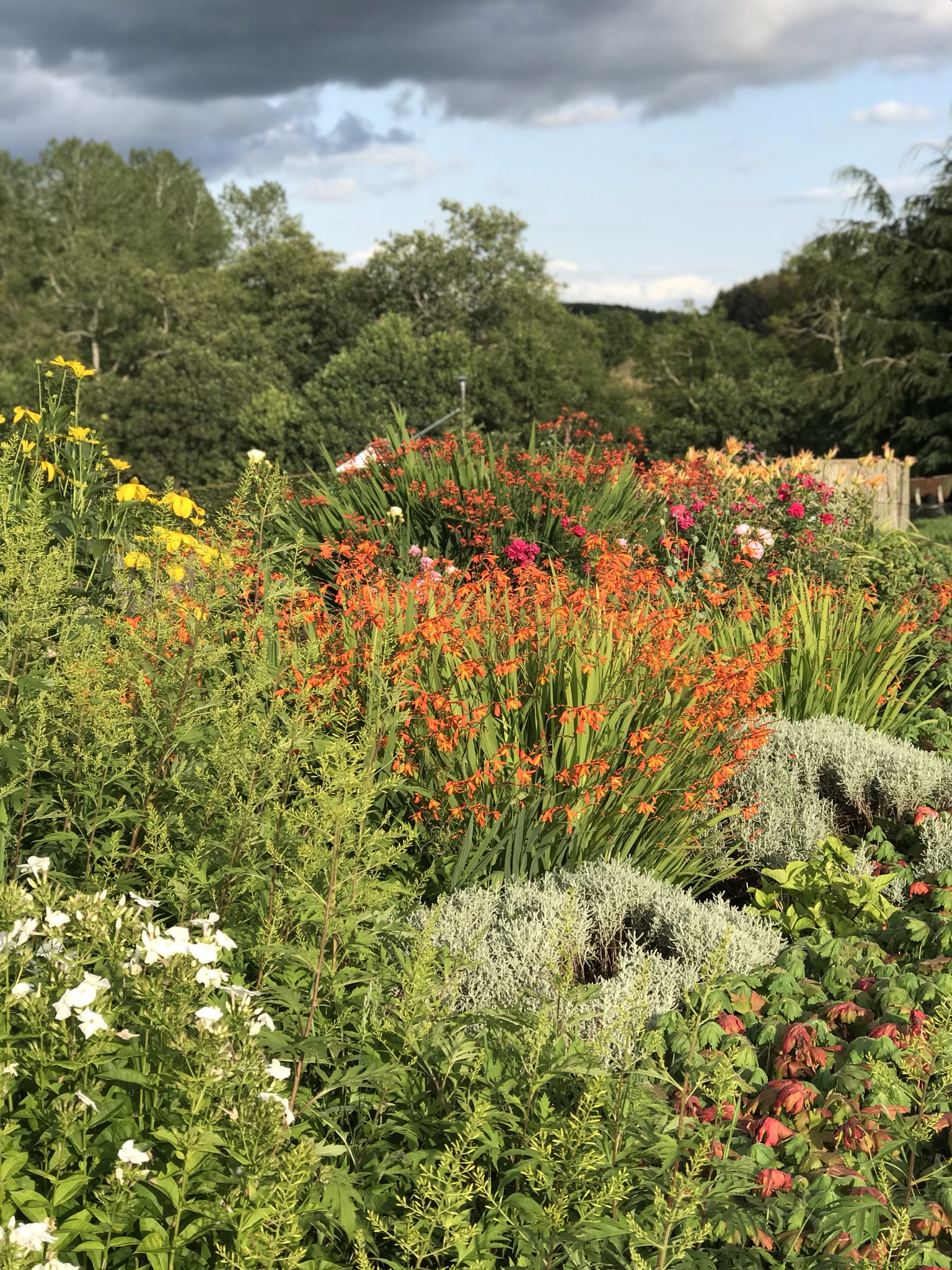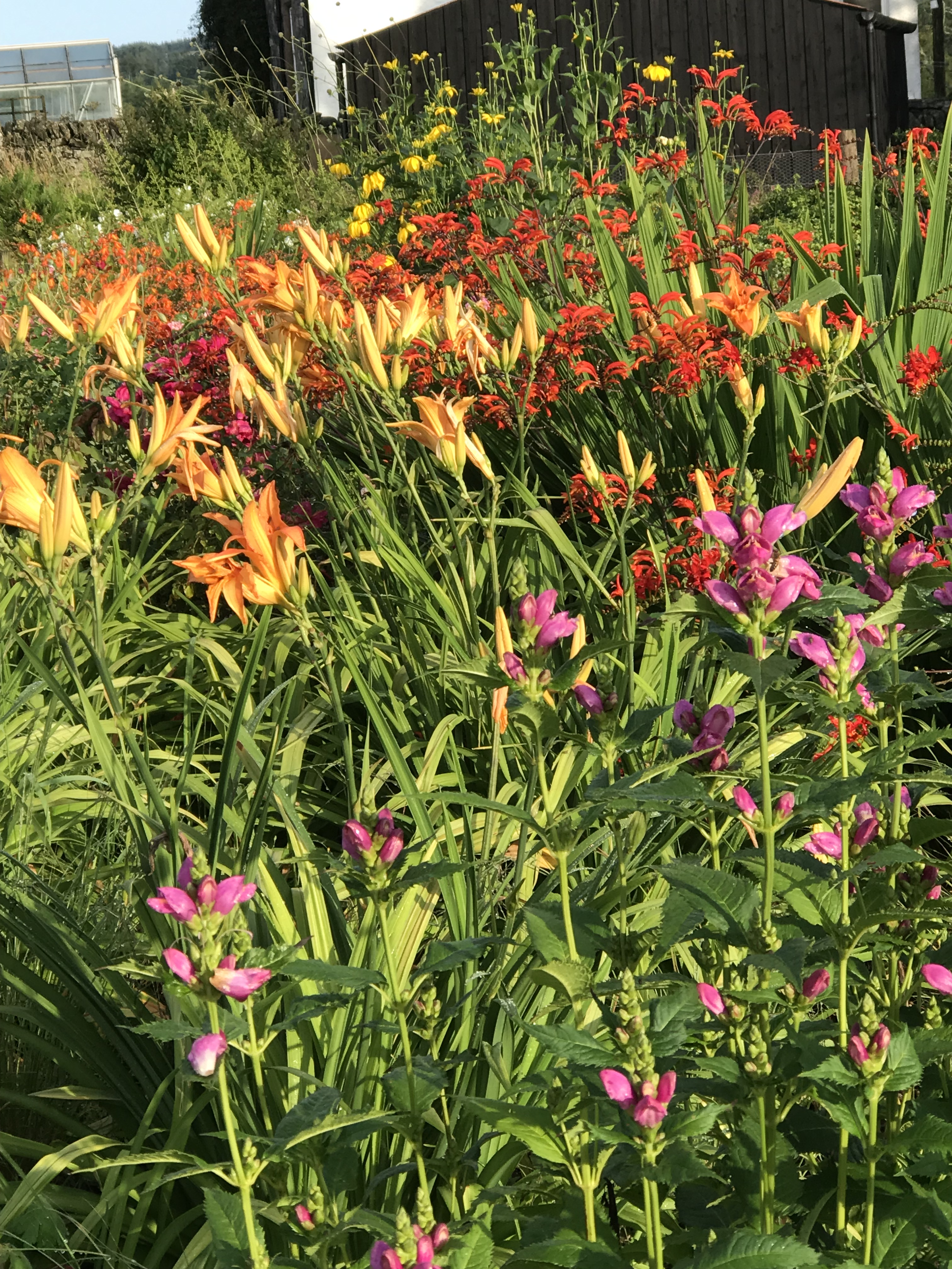 My neighbour gave me several plants for one of them and so it became known as the Colin Crosbie border. It is looking very good this year packed with mainly herbaceous plants and some succulents, which have flowered handsomely in the hot weather. In the early season there are geums, roscoea, uvularia, yarrow and violas. Then come the ginger plants, diorama, Jerusalem sage and angelica. In high summer we have actaea, yellow crocosmia, eupatorium and penstemon. No doubt I have missed some off the list. Here’s how it looks: