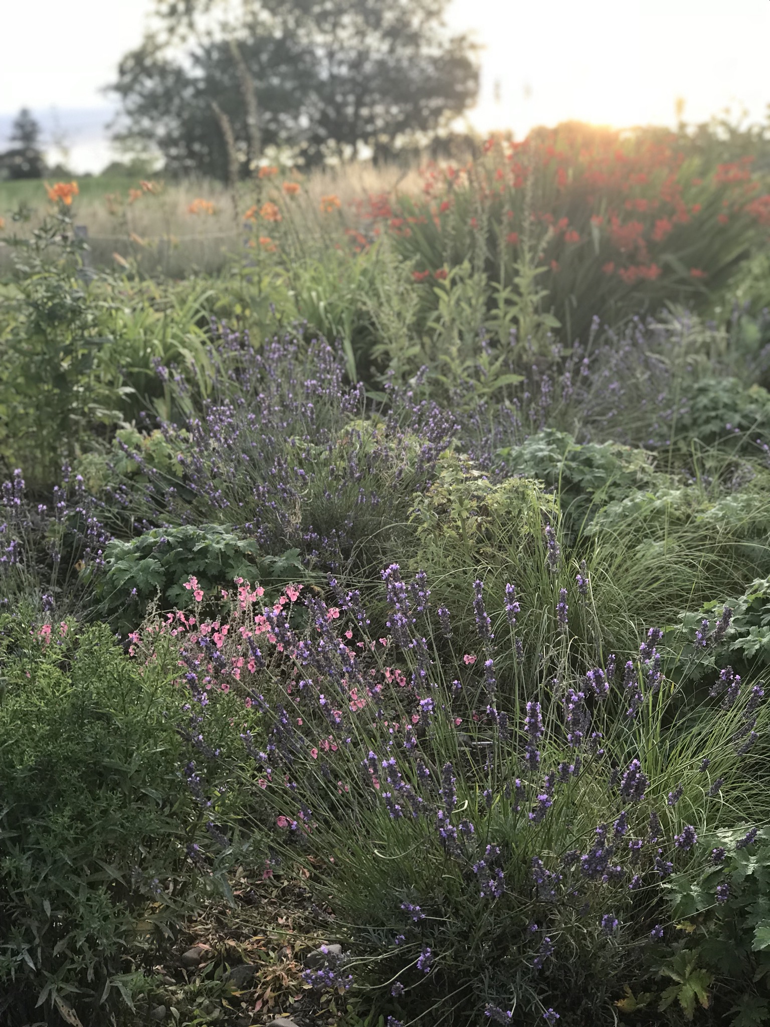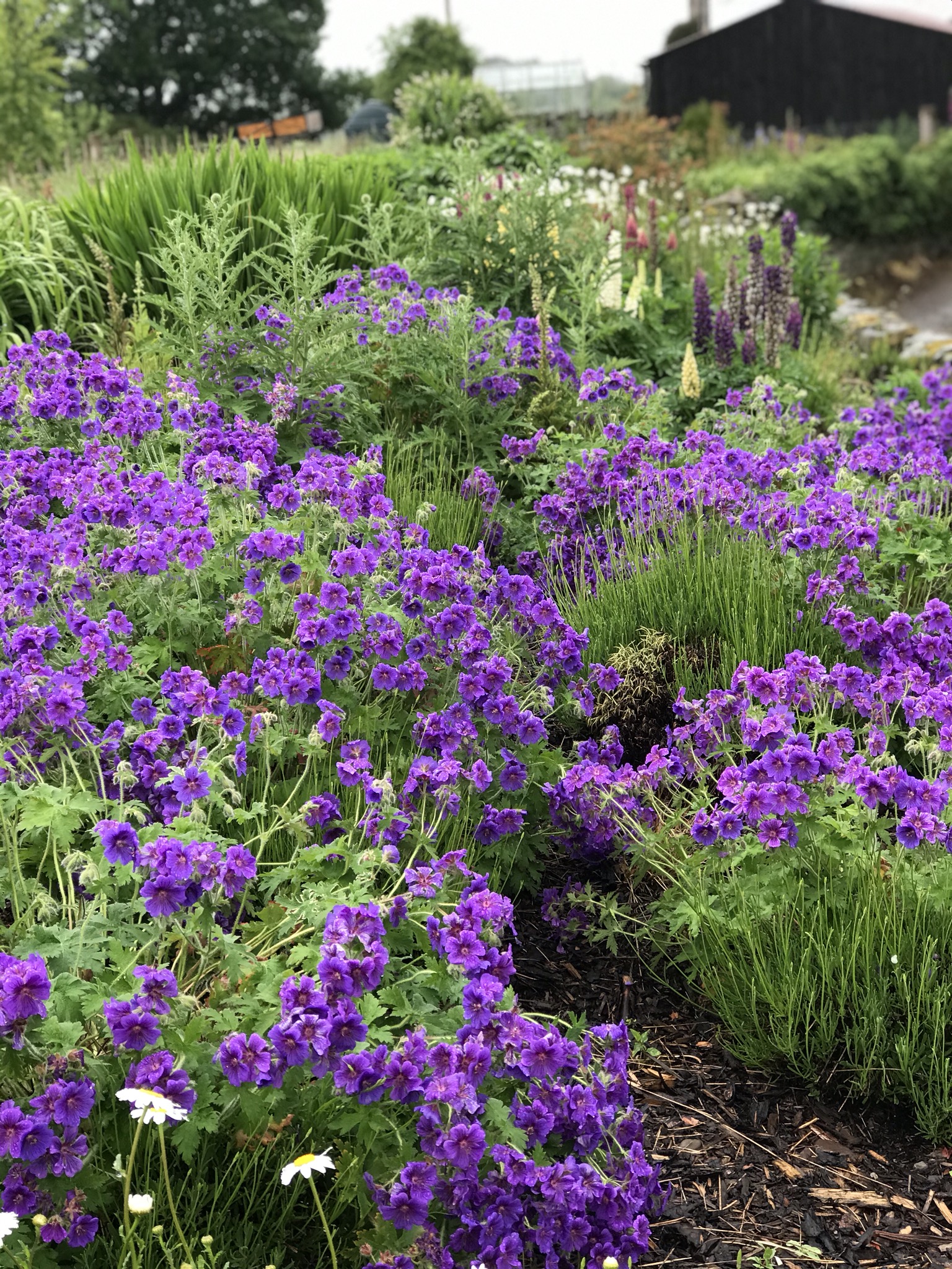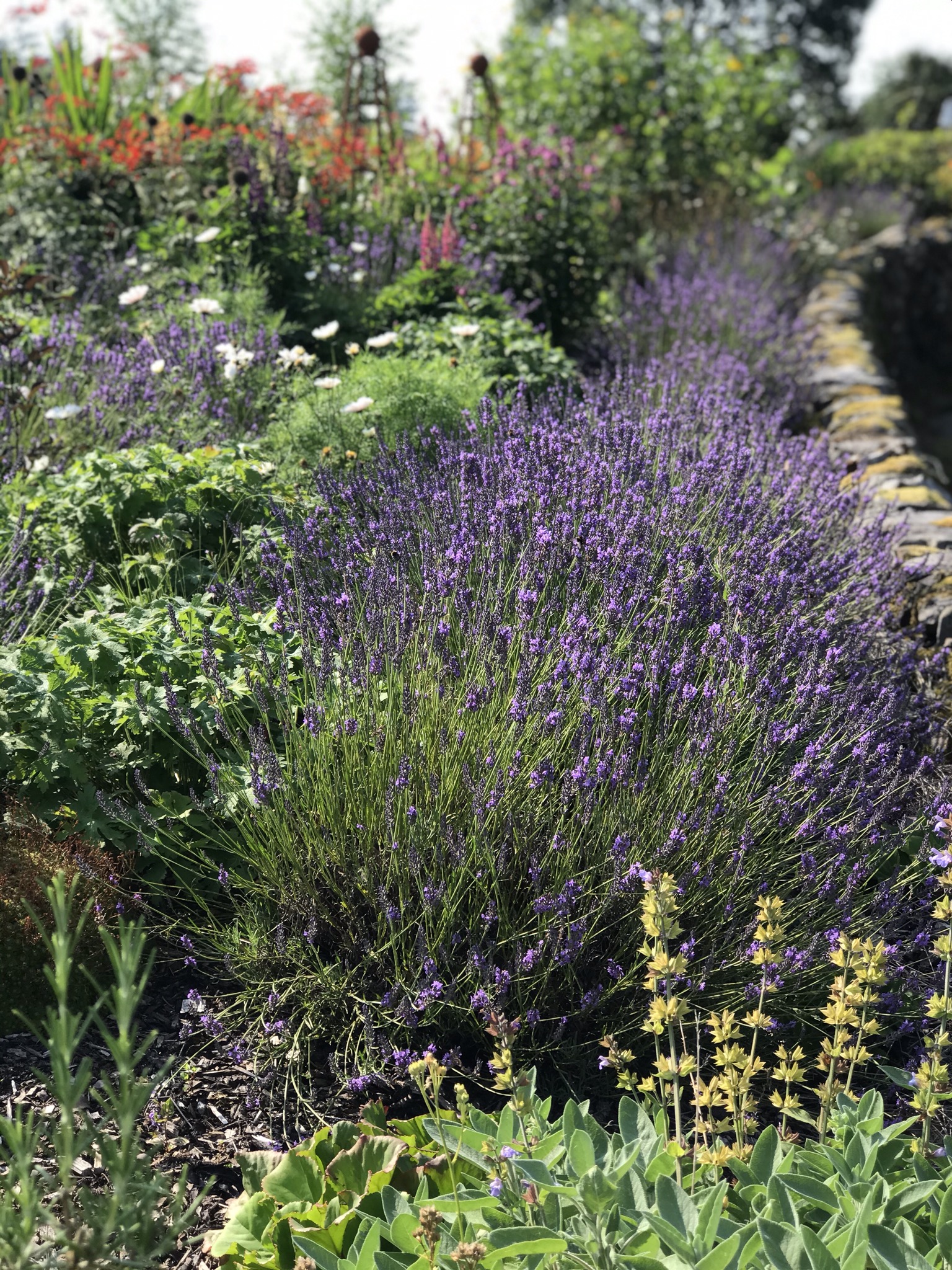 The other border, on the poorer soil, I conceived as an homage to Beth Chatto and her gravel garden. To begin I planted oregano, cranesbill, catmint, ice plant, ornamental grasses, euphorbia and santolina. The results were mixed and too many weeds got a hold. More recently I introduced vinca major and then perennial pea. They have both trailed magnificently, the first in spring with china blue flowers and the second in summer with lovely garnet coloured blooms. Now the whole bed is a mass of foliage and flowers, invaded only by unwanted raspberries that are seeded by passing blackbirds. Such gaps as remain I am filling up with lavender, asters, and also annual cosmos. At the front margins there are gifted carnations and pelargoniums. To give height I have added a couple of mahonias, a spindle tree and two contrasting Japanese maples. Quite a lot in a fairly small space. Like this: