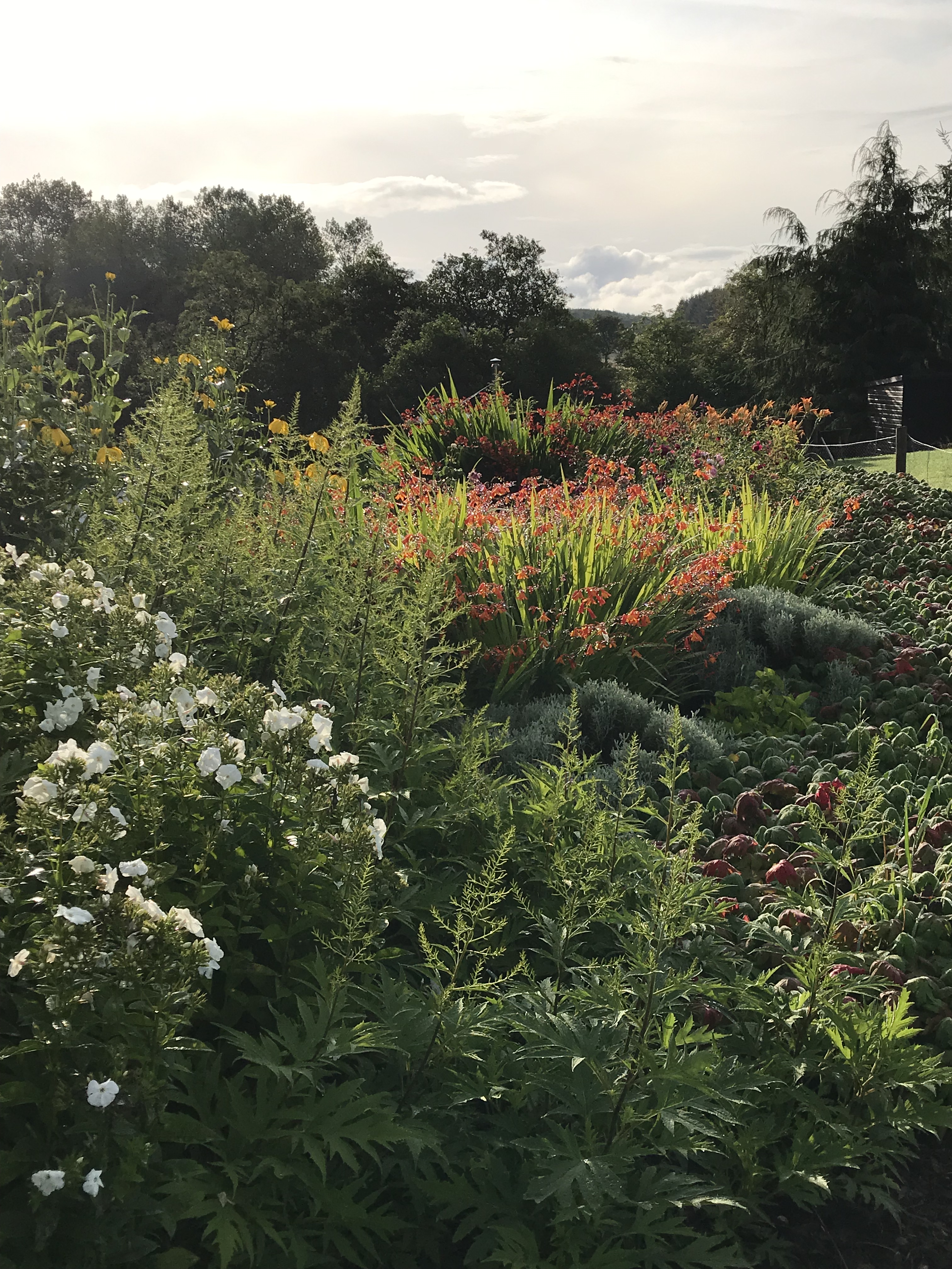The question now is whether to go any further? I am wondering about a third border between the existing two – an island bed that will draw the eye down the slope from the family terrace. There is a slightly elevated area that might well define the footprint. It is extremely tempting. At the moment I am not sure what planting would work well there. It needs to sit well in the borrowed landscape of beech, rowan, birch and hornbeam that grow behind it. There is also the possibility that the soil will be poor.