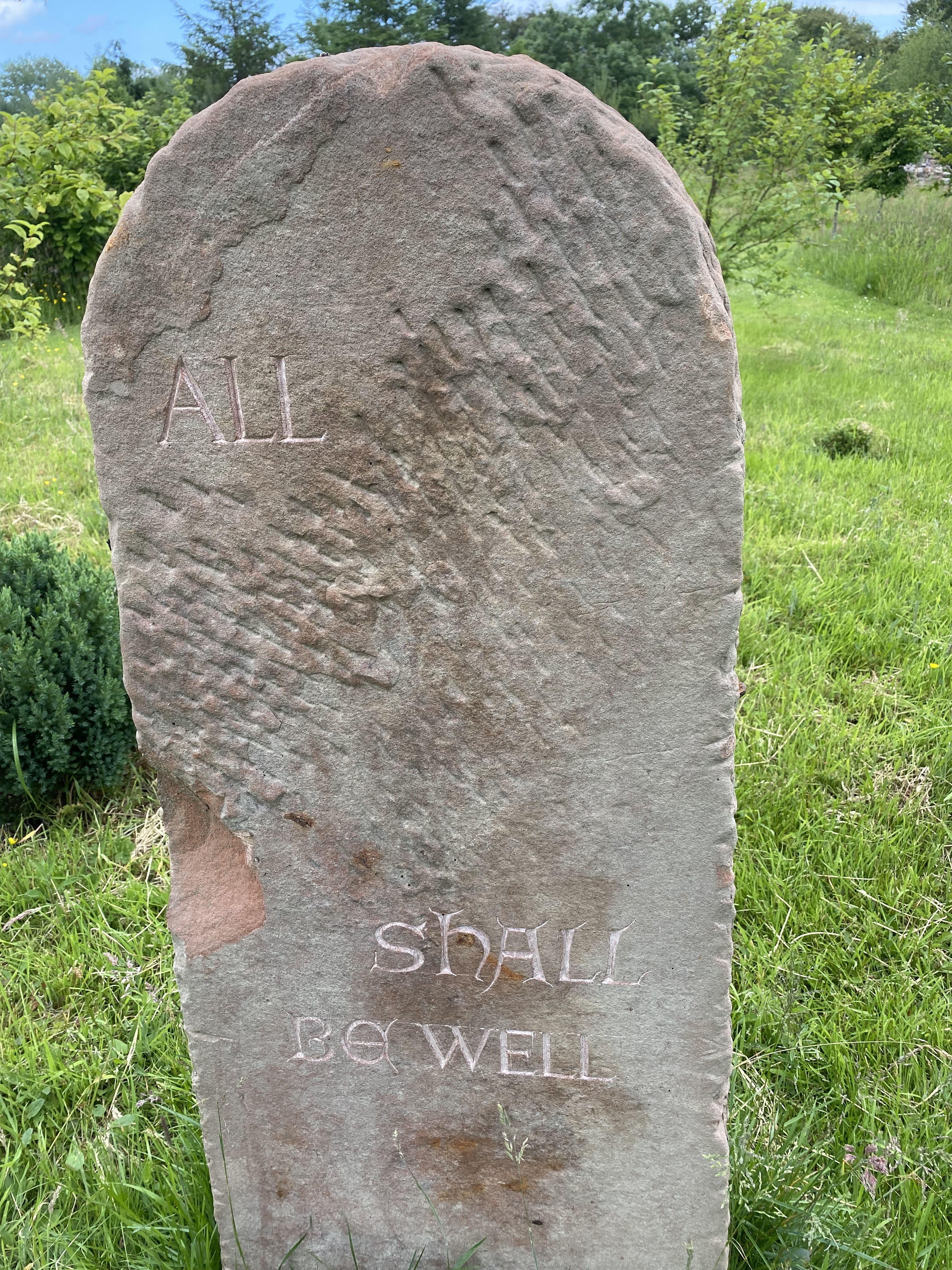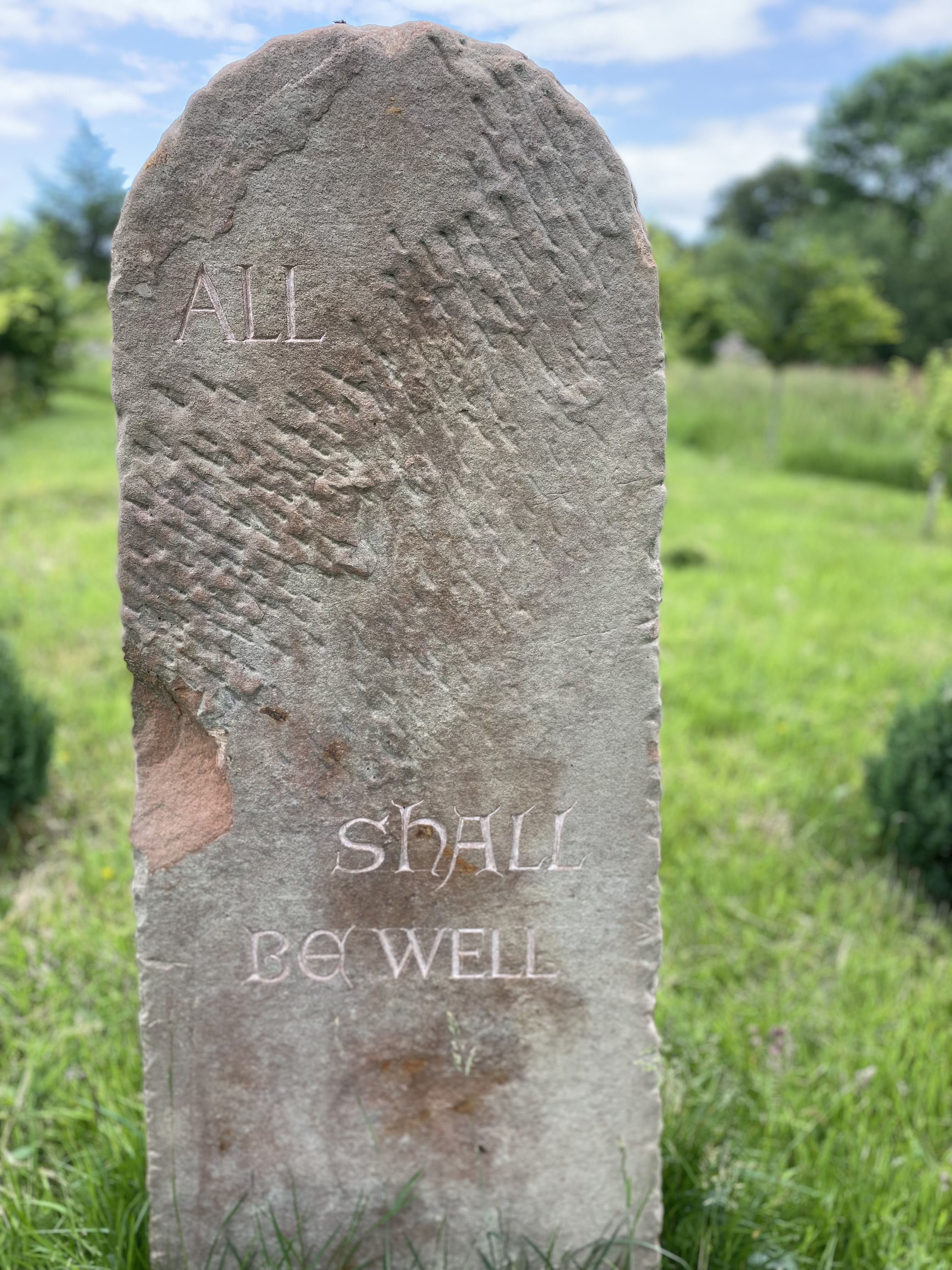 I hope a local stonemason will carve some words for me in the smooth patches between the fleck marks on the stone. I have chosen a phrase from Julian of Norwich, the Medieval mystic, who despite all her multiple sorrows and tribulations, proclaimed repeatedly that ‘all shall be well’.