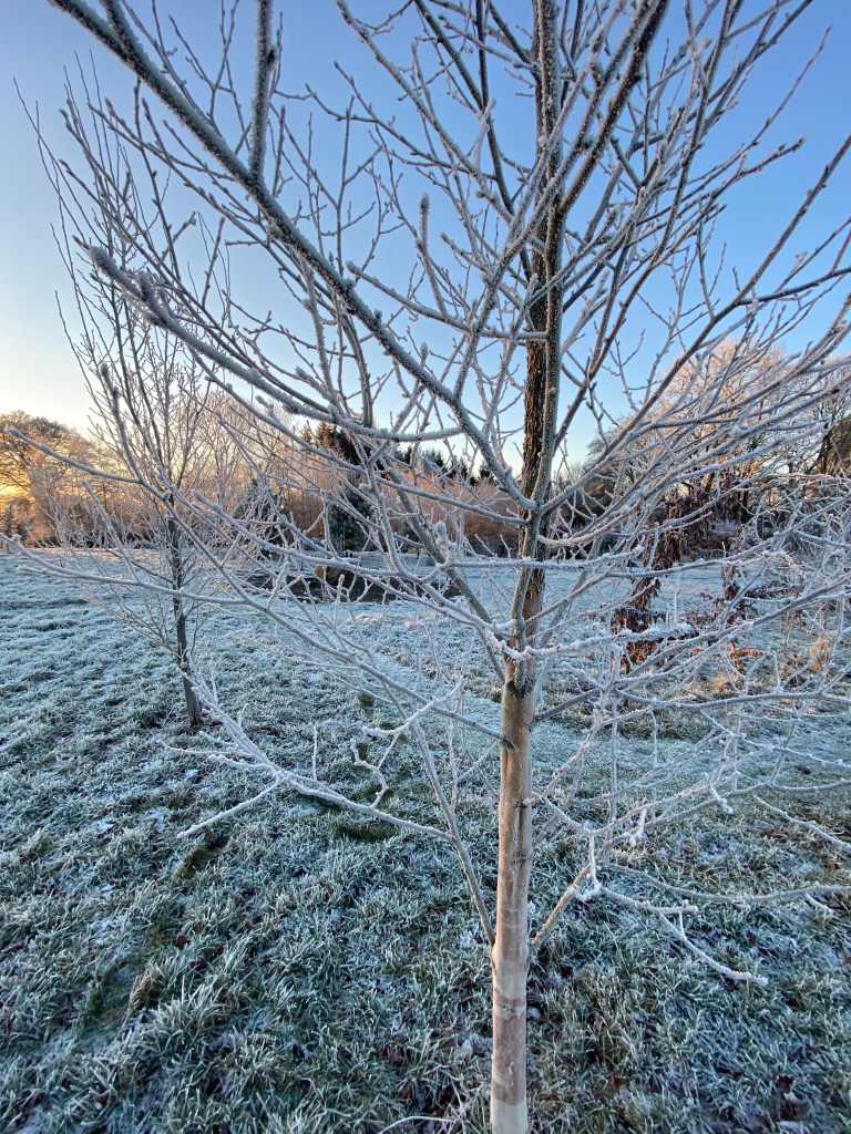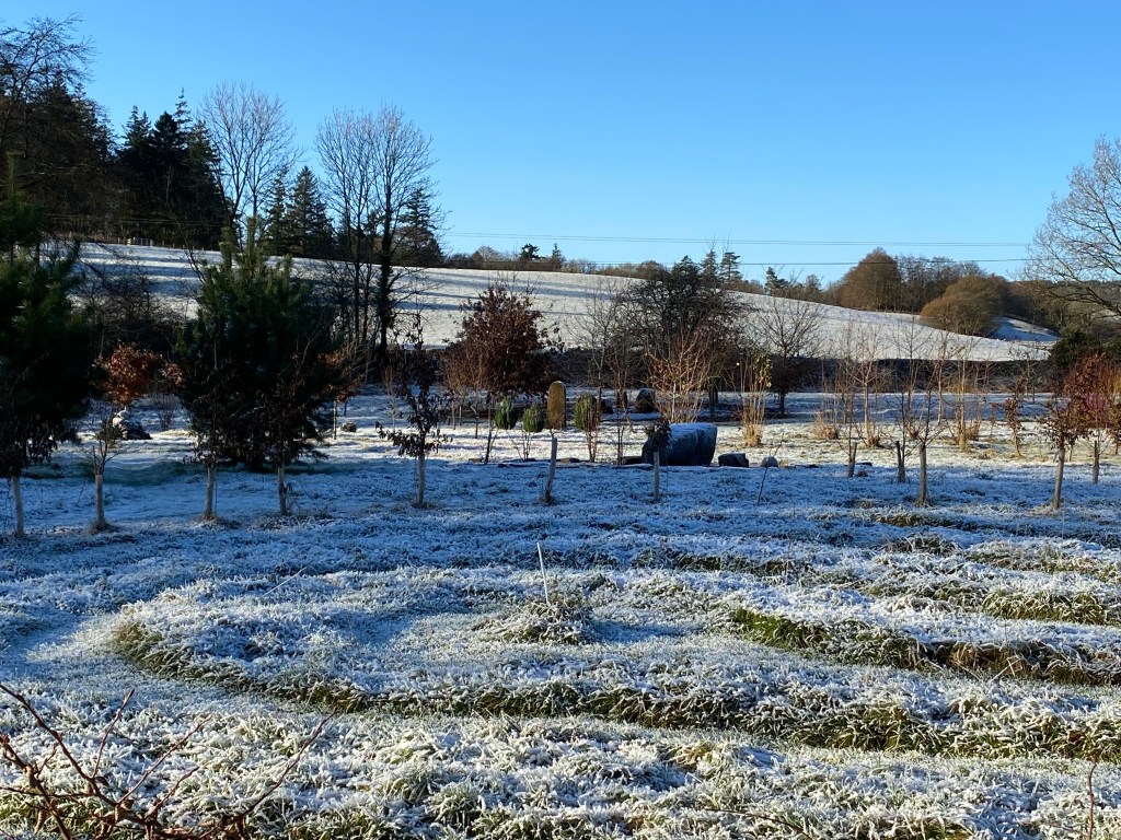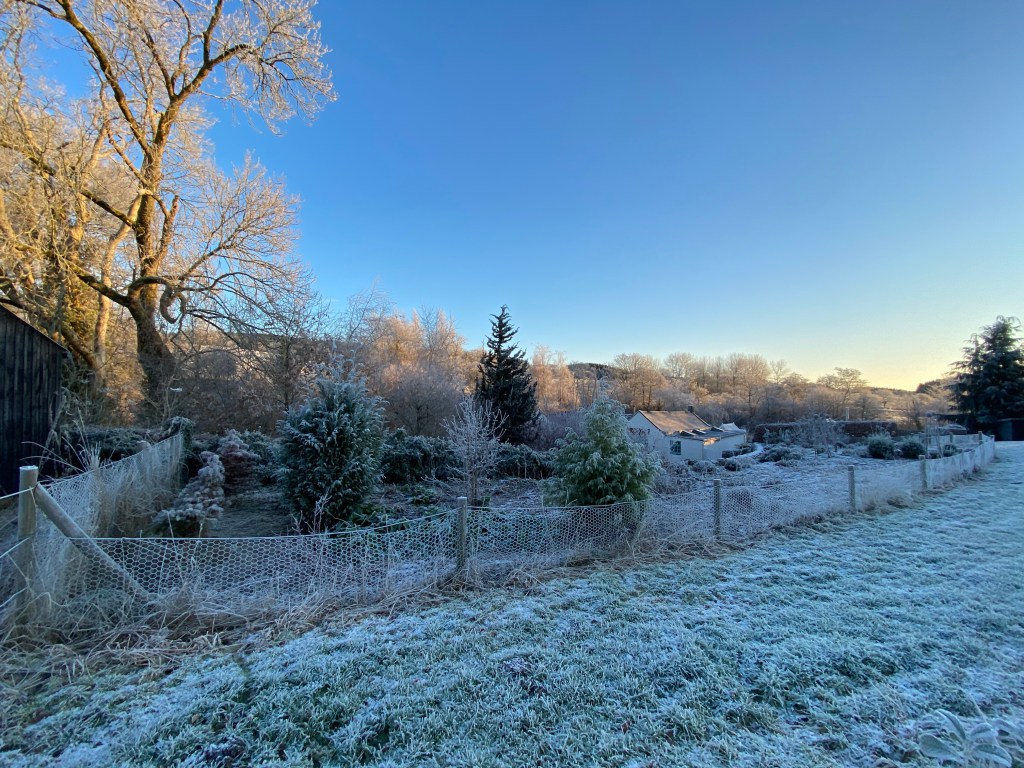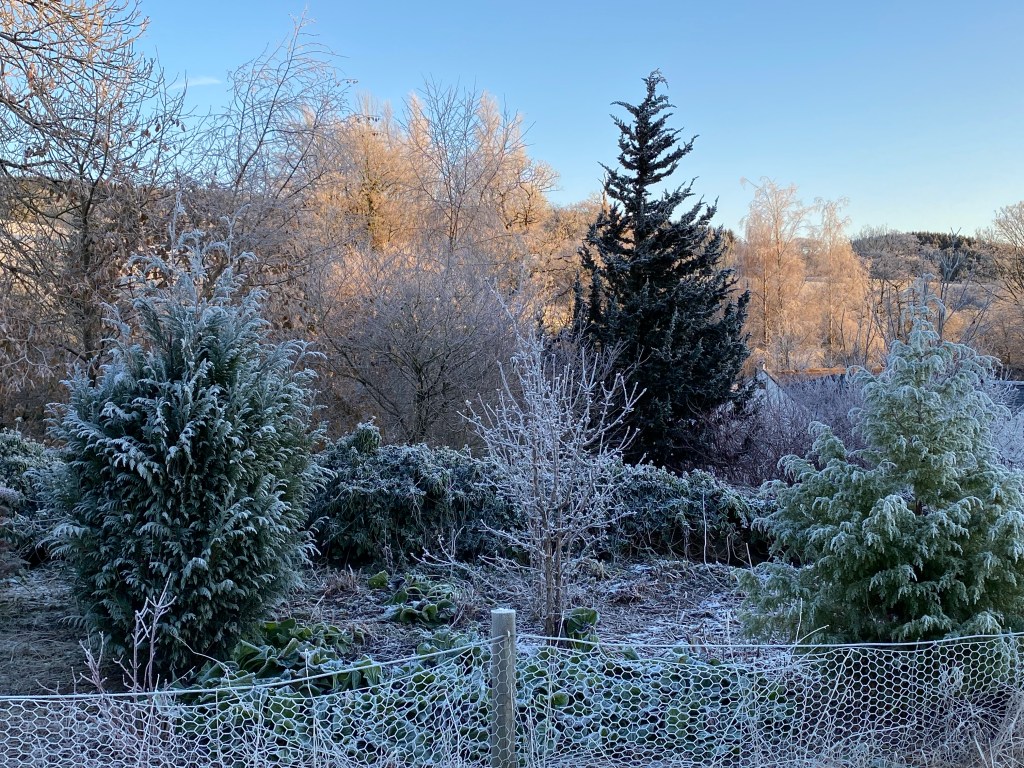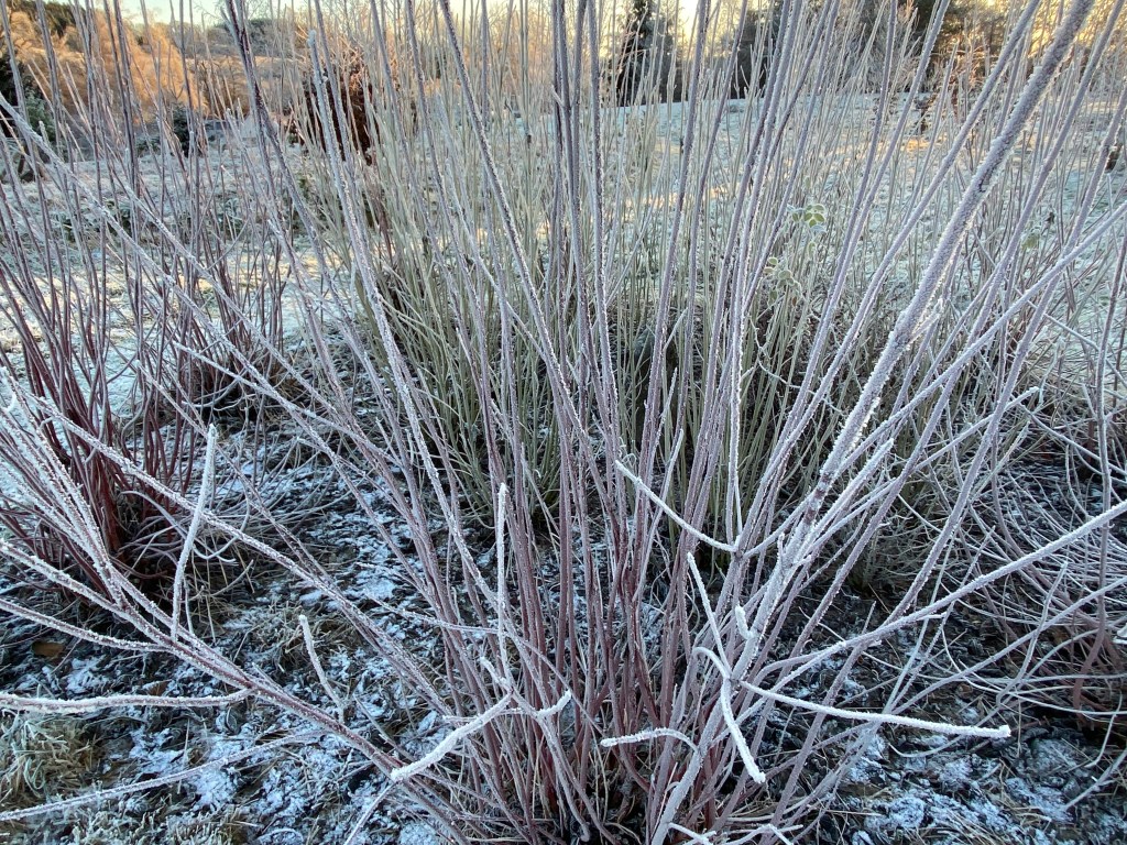 During these past few weeks and up to the 19th of the month, perhaps the most memorable feature in the garden has been the heavy frosts we encounter each morning. Following a cloudless night and usually just before light is about to break, the sharp sub-zero air has descended, so that by the 7am dog walk, a white carpet awaits us, already set off by the sun’s slanting rays – and with them – the promise of warmth later in the day.