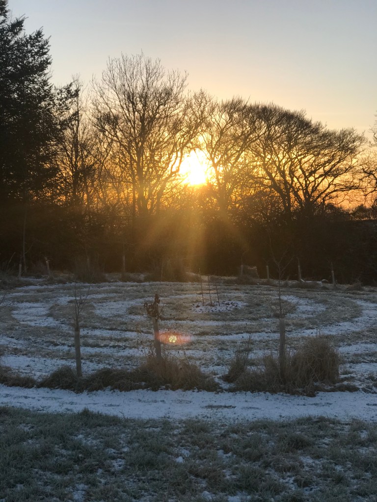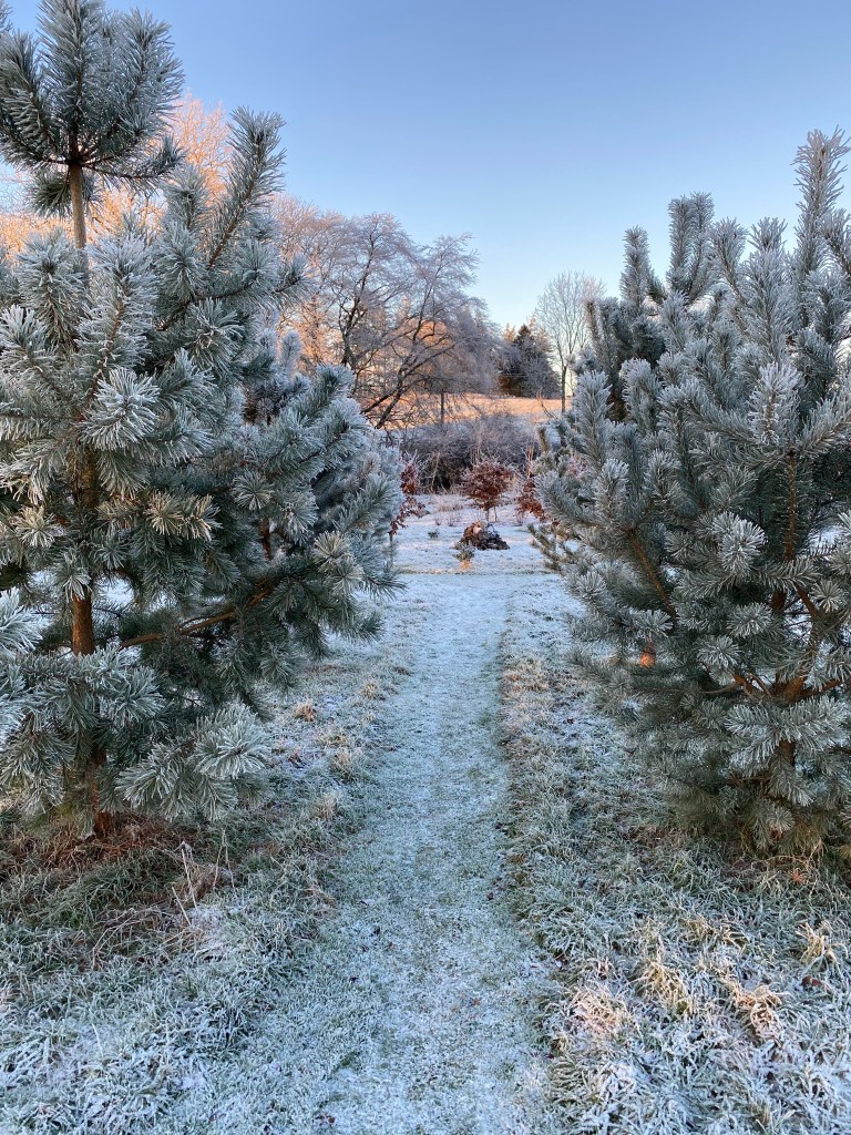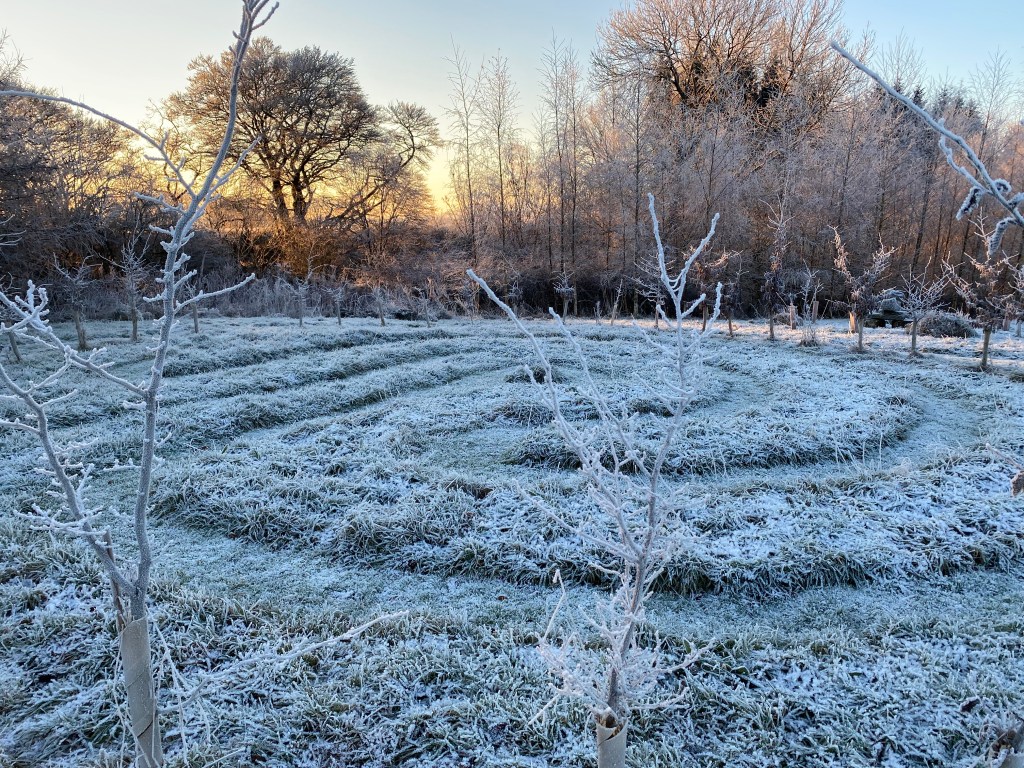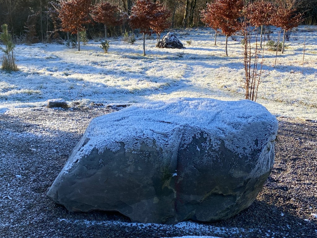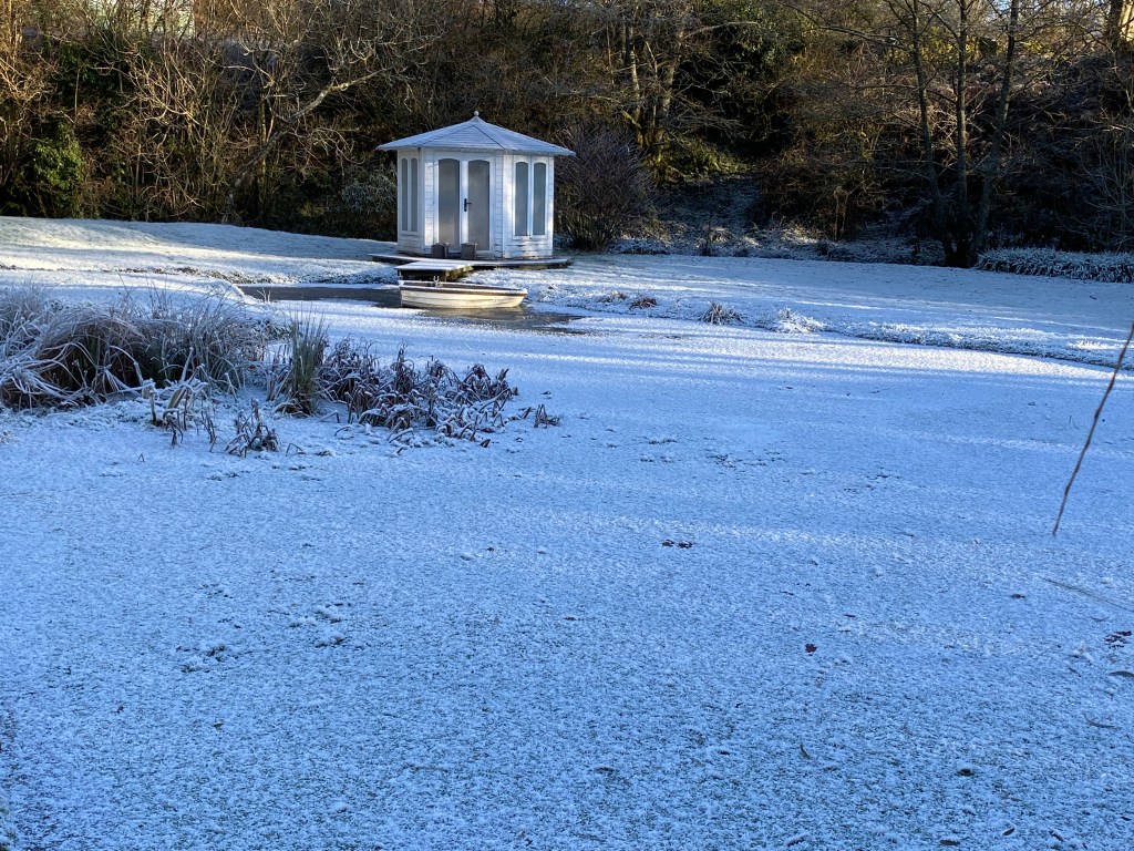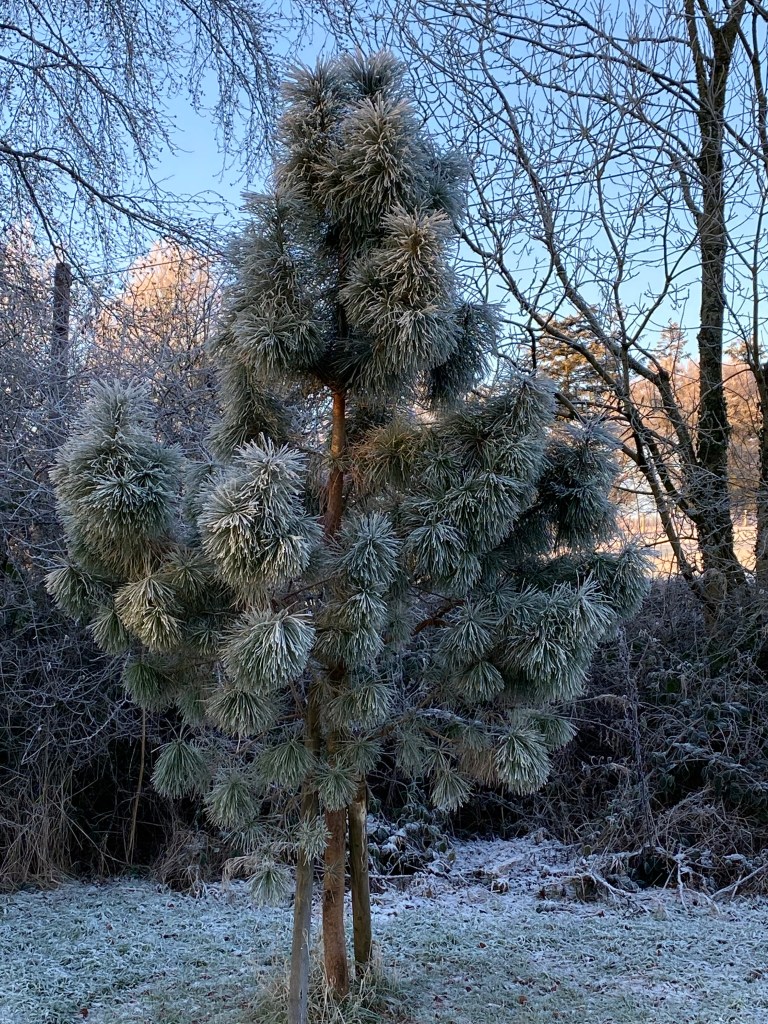 During these past few weeks and up to the 19th of the month, perhaps the most memorable feature in the garden has been the heavy frosts we encounter each morning. Following a cloudless night and usually just before light is about to break, the sharp sub-zero air has descended, so that by the 7am dog walk, a white carpet awaits us, already set off by the sun’s slanting rays – and with them – the promise of warmth later in the day.