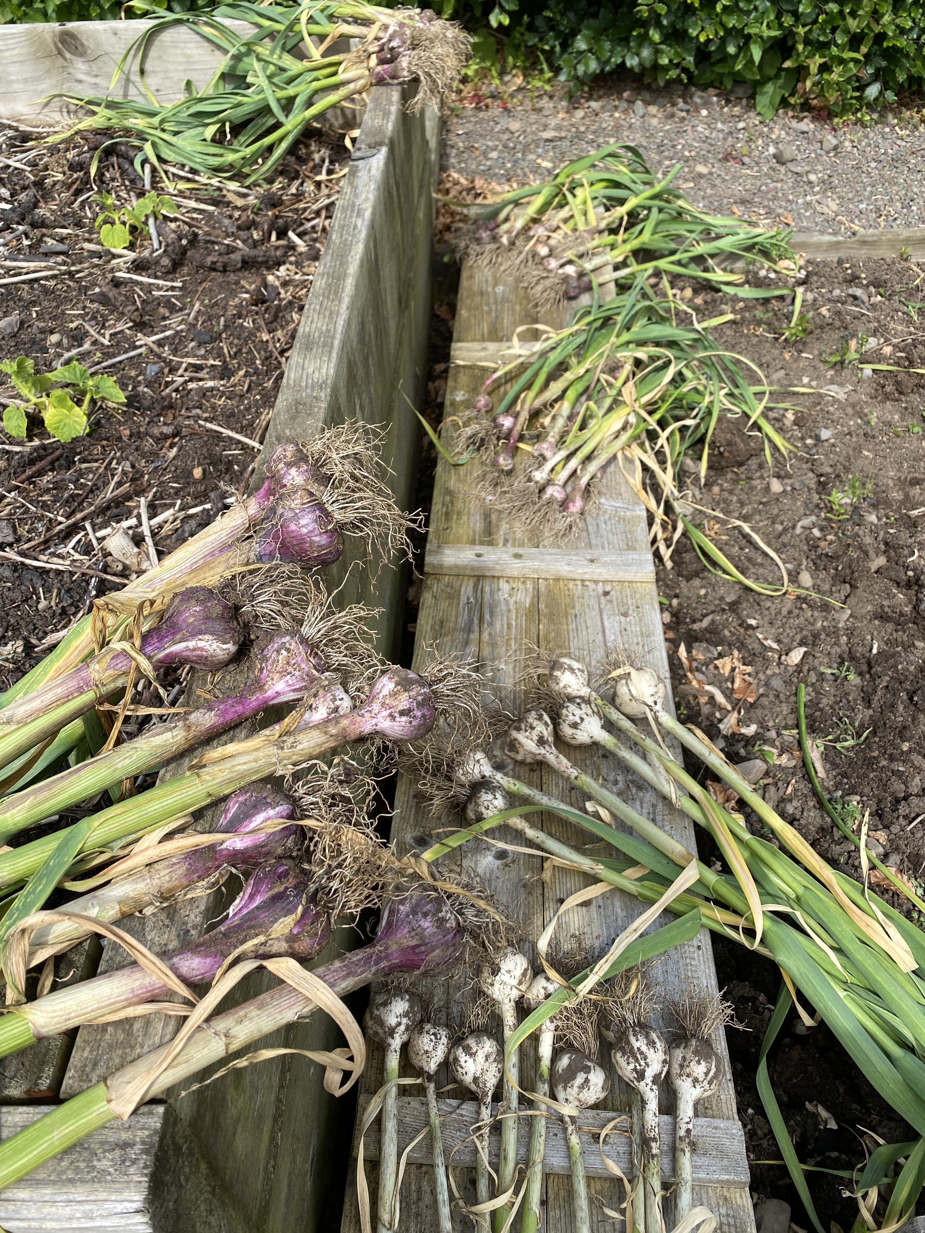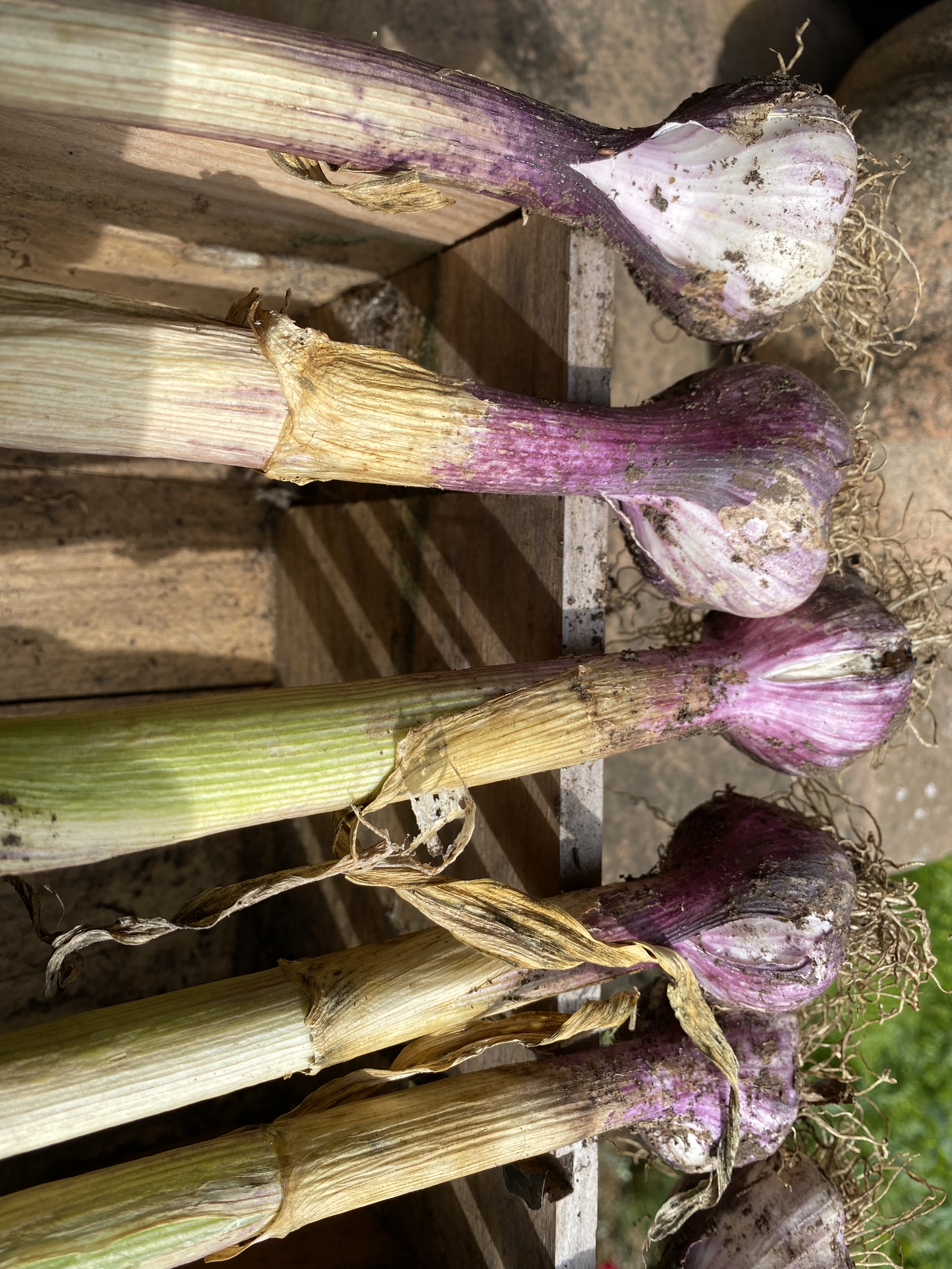 The plants seemed unperturbed by snow and frost and with the arrival of Spring 2022 they soon began to bulk up. When a flush of weeds came in May, I carefully removed them. But beyond that there was little to do but let the plants run their course. By the first week in June I could see that they had ceased to grow, some were starting to yellow, though none hinted at flowering. I dug one up and found a beautiful, firm purple bulb. It appeared the crop was ready for harvest.
