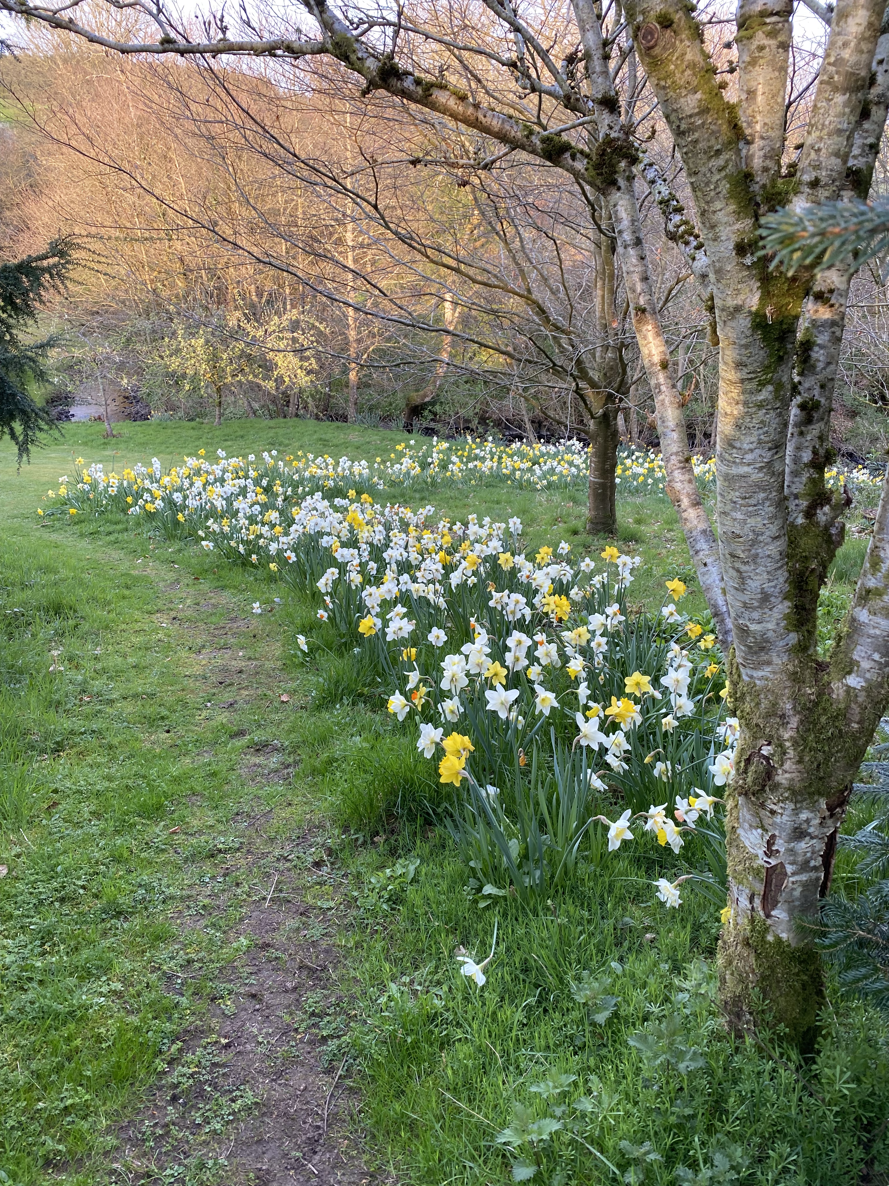 To improve the spring outlook beyond these borders, last Christmas I planted 95kg of mixed narcissi, bought as a job lot. They immediately produced a terrific effect down towards the burn and under the fruit trees. Here I am letting the grass grow longer and have also introduced a mass of home grown oxeye daisies for early summer interest. More optimistically I have scattered camassia seed, gathered from elsewhere in the garden (1). This whole area will be strimmed just once in late summer before we pick the plums and apples.