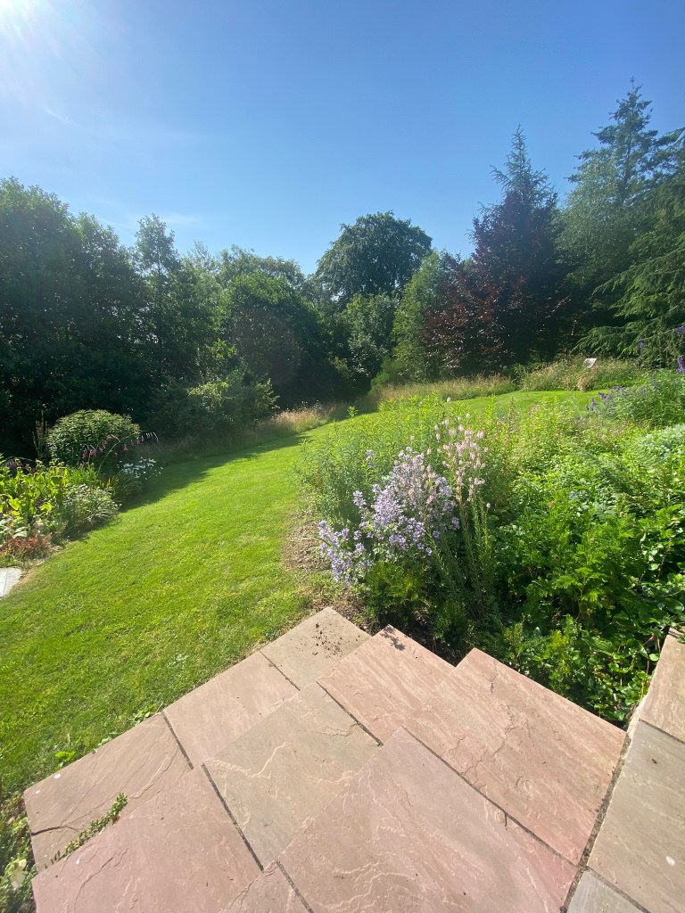 In the spring of 2021 we installed my first ever greenhouse in an area to the back of the house and created a lovely terrace around it. Quite quickly it has become my favourite pottering space: checking on the greenhouse plants, bringing out others to harden off or display and of course, sitting out for meals and conversation when the weather permits. This ‘family terrace’ has four steps that lead down to a mown grass area that is already flanked by a couple of borders and is home to two productive fruit trees, one apple one plum.