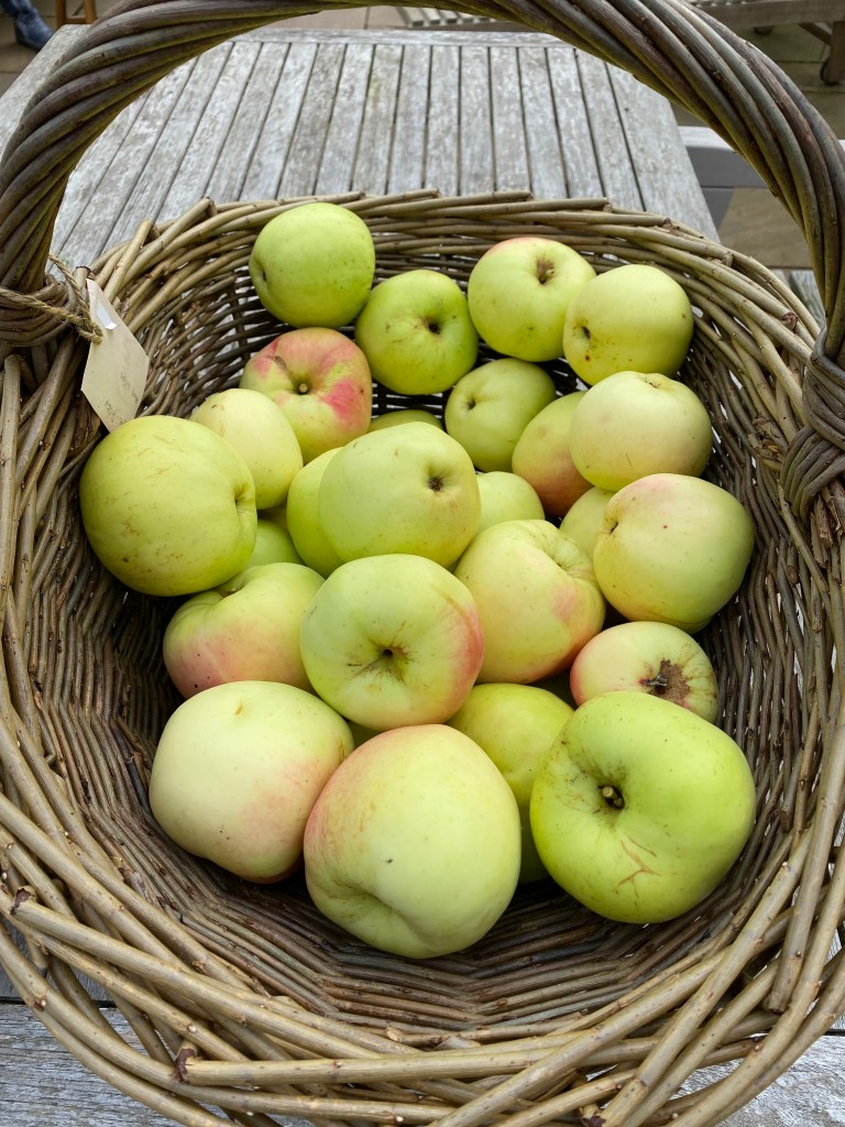The nip of frost is good for apples I’ve been told. They’re said to be all the sweeter for it. So there’s no weeding or border tidying today. It’s out with my apple basket and time to gather in the first crop of Malus domestica.