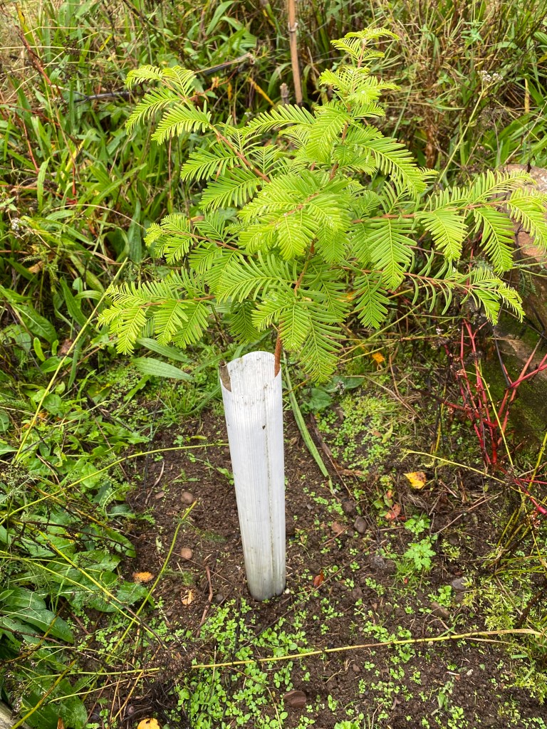 This year on the opposite side of the field I have planted a Giant Redwood. Diminutive on arrival, within its first season it has put on excellent growth and its soft green fronds are now protruding from a protecting tree guard. Surely it will need to be carefully staked in due course.