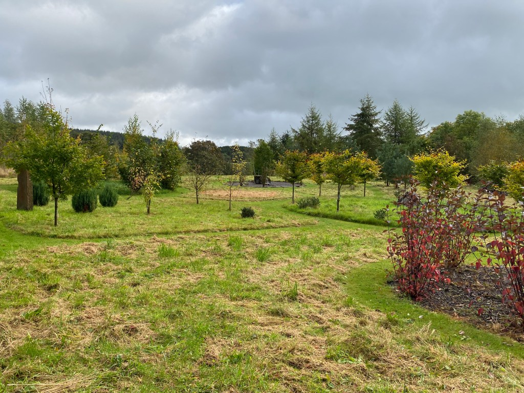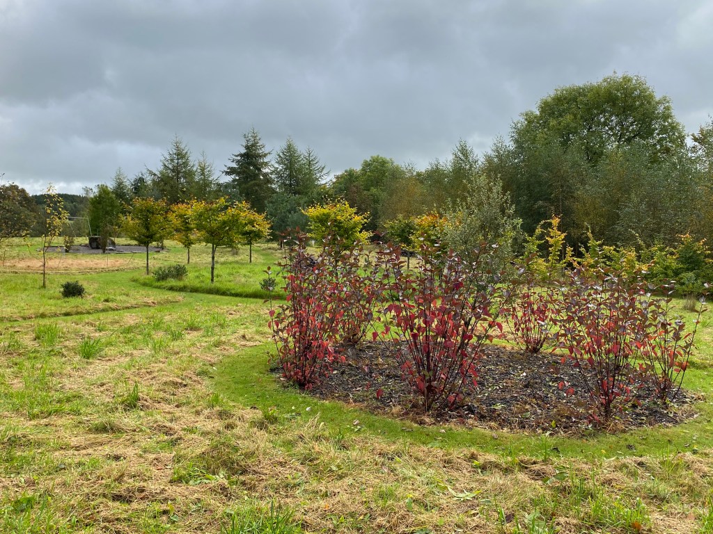 Another addition this year has been three bronze red azaleas, already settling among a group of rowans, themselves heavy with burnt orange berries. Likewise a transplanted deep red Japanese maple, self-seeded elsewhere in the garden, is making good progress nearby. I am contemplating a few more singleton specimen trees for planting next year.