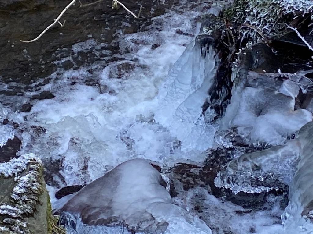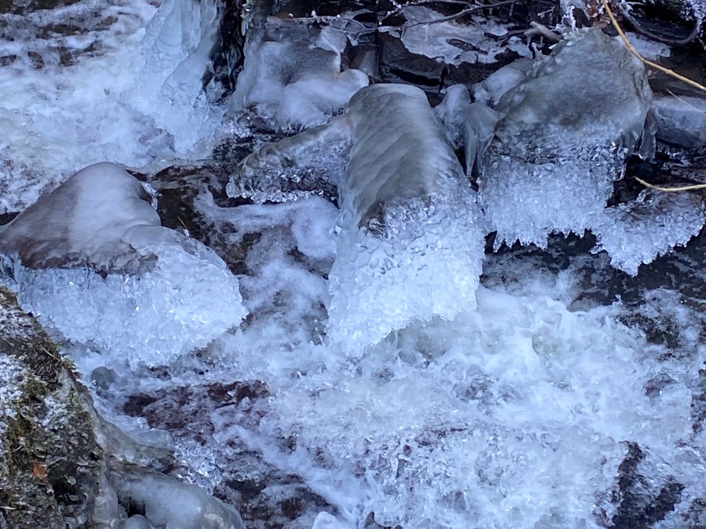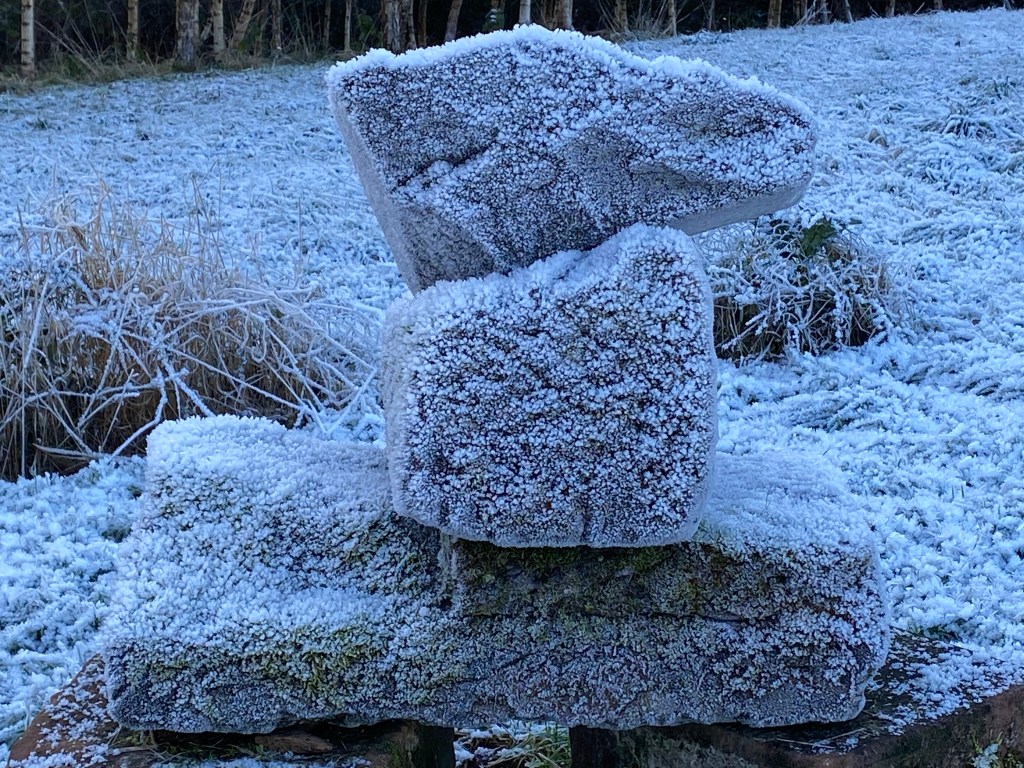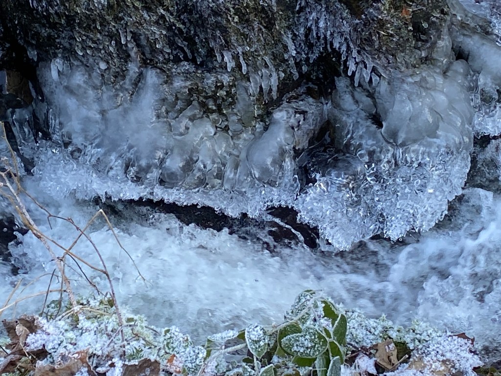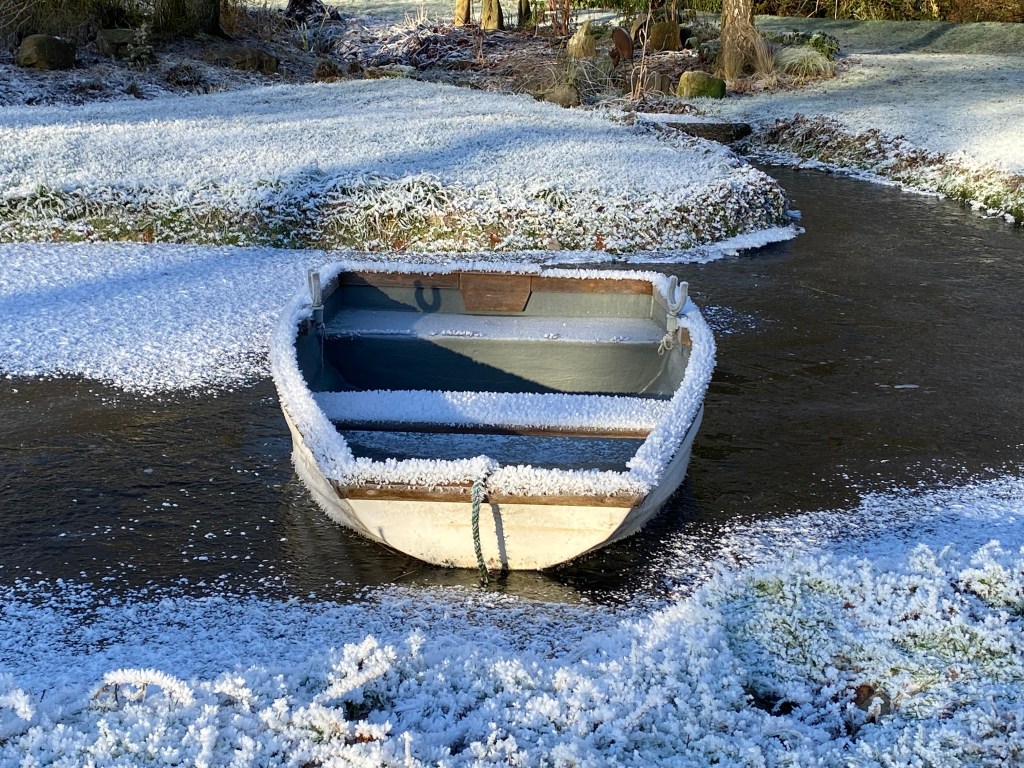 Hoar frost on trees and shrubs has thickened in compelling layers of crystalline geometry. Ice formations at the weir have begun to bulge and swell. The pond is frozen over and has marooned my little dinghy, like a miniature Discovery in the ice.