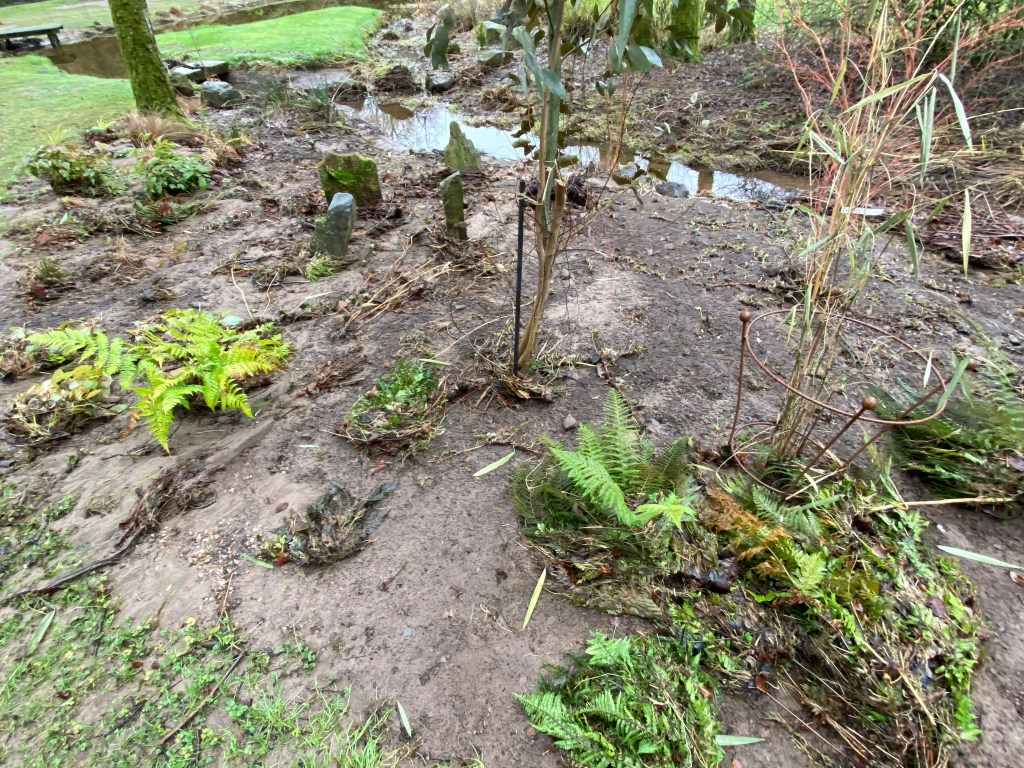 On a first look, most apparent were the thick layers of silty sand that had deposited in swirling patterns across the borders and on the grass. This had completely obliterated some low growing plants, which we now hope, without much confidence, will eventually reappear. Larger specimens such as ferns, hellebores, epimediums and daphne had caught the flood full-on and been flattened or strangled by debris suspended in the water. Leaves, long grass, roots, twigs and branches in large quantities were entangled in foliage or washed up in drifts against trees and low walls. It was a sorry sight.