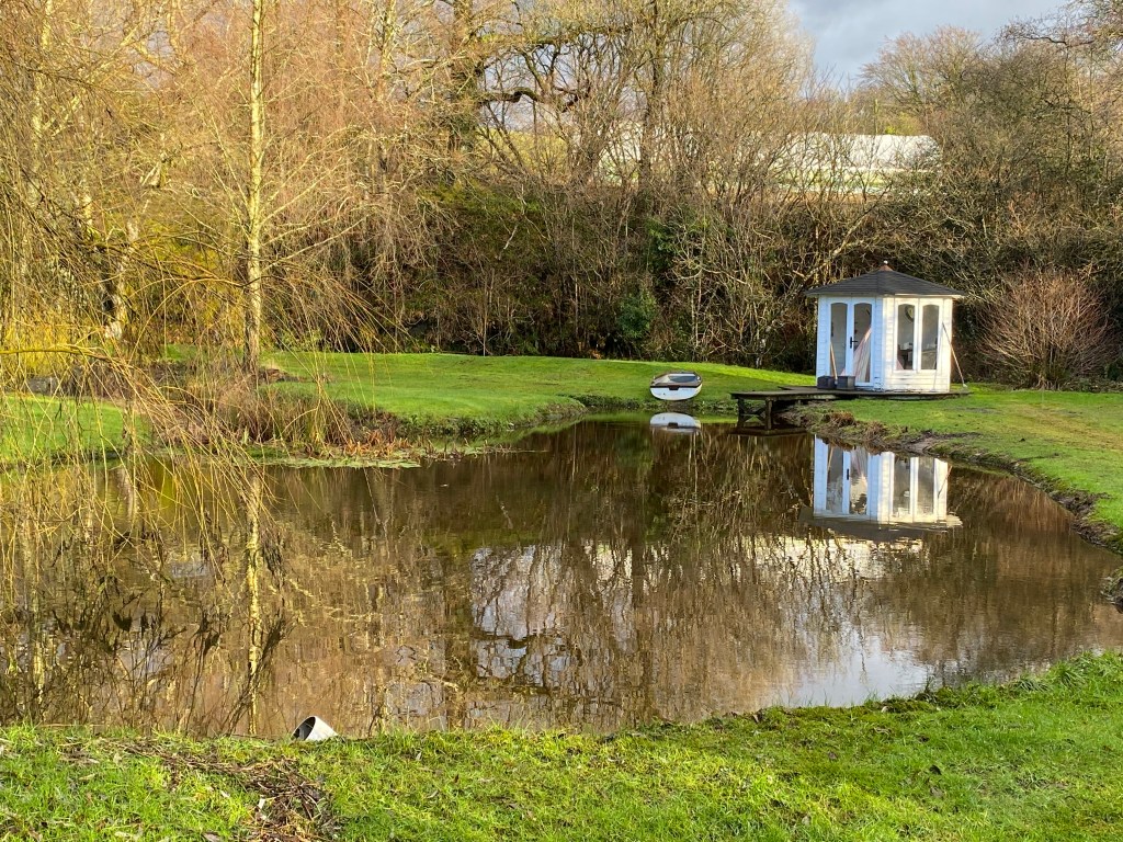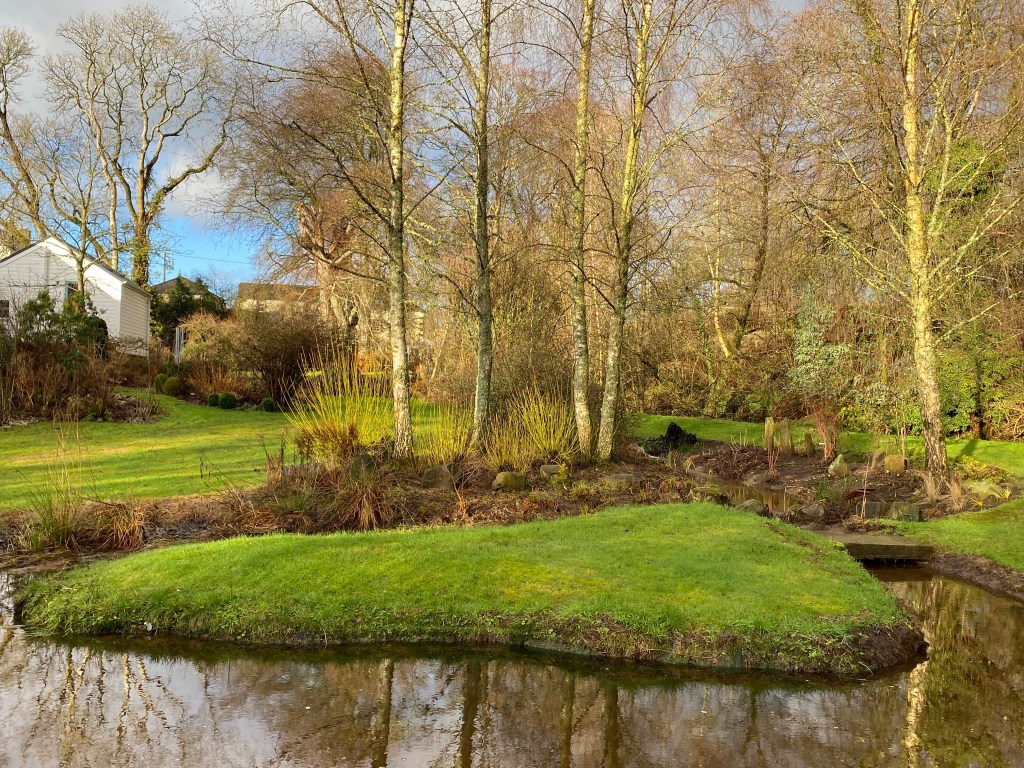 Over a couple of evenings a digger was brought in to scoop out the wettest area, and the resulting spoil was piled up on the banks of the burn to restrict further water ingress. A pipe was installed from the burn to the excavated area, which quickly filled up as a large garden pond came into existence, the water held by the silty mud beneath. The addition of another pipe at the lower end allowed excess water to flow back into the burn.