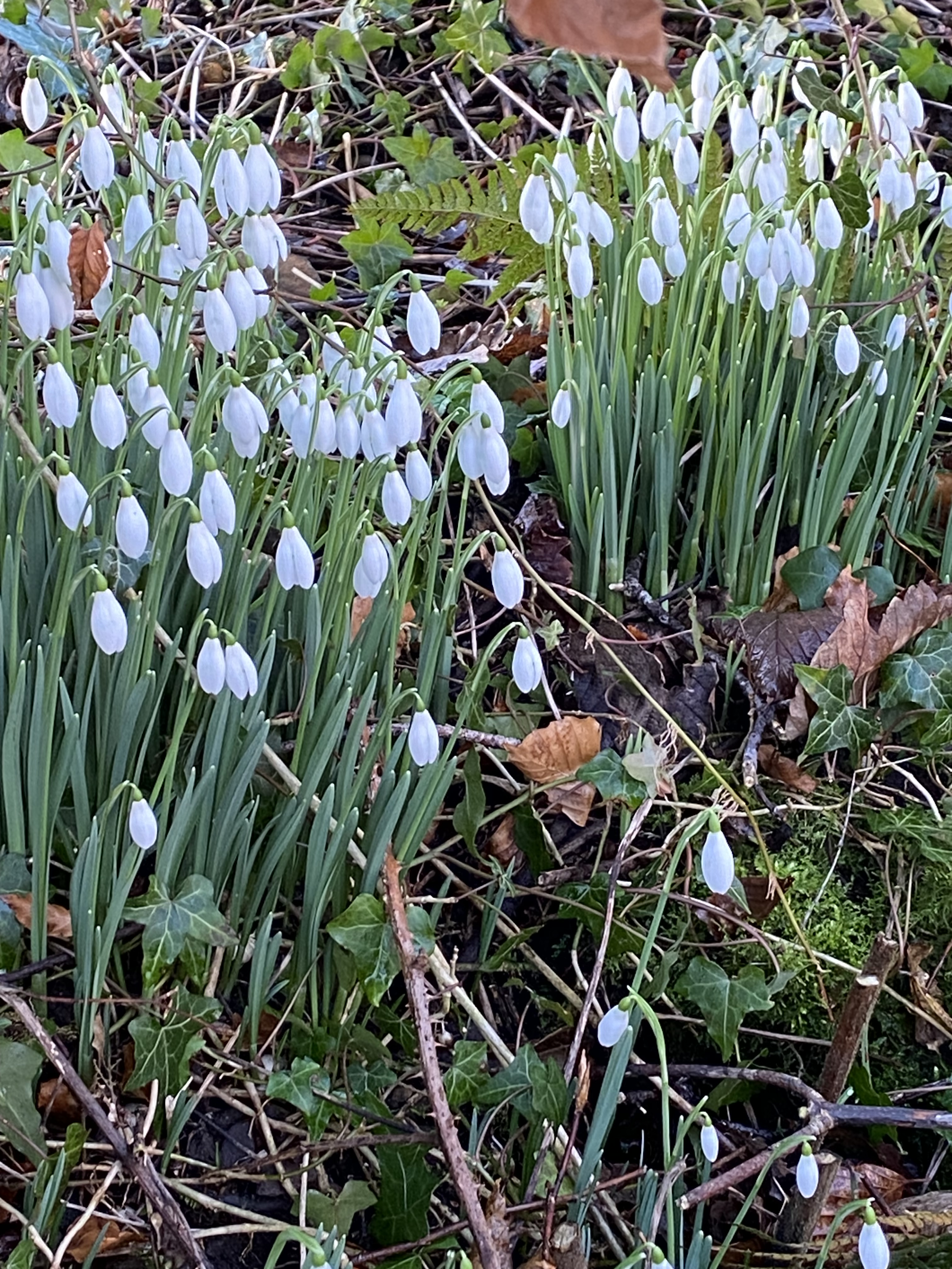Of course, snowdrops are synonymous with February and get pride of place. They’re also tough, and resilient to a sharp drop in temperature. In these parts they are having a good year, with great swathes in the woodlands and bright splashes along the hedgerows and loanings. Is it my imagination, or are they spreading – moving into new spaces and brightening up still more dark corners on a dark day?