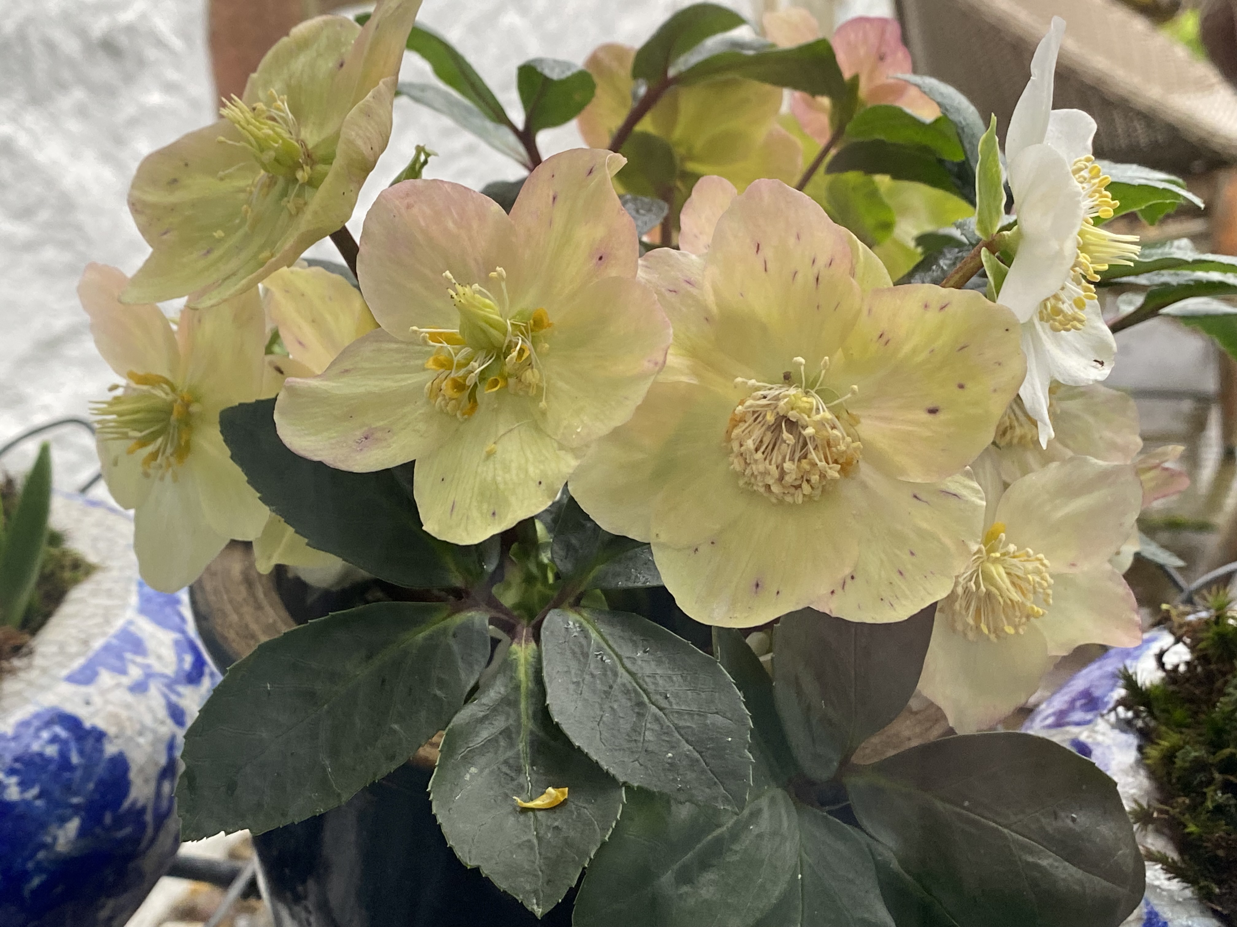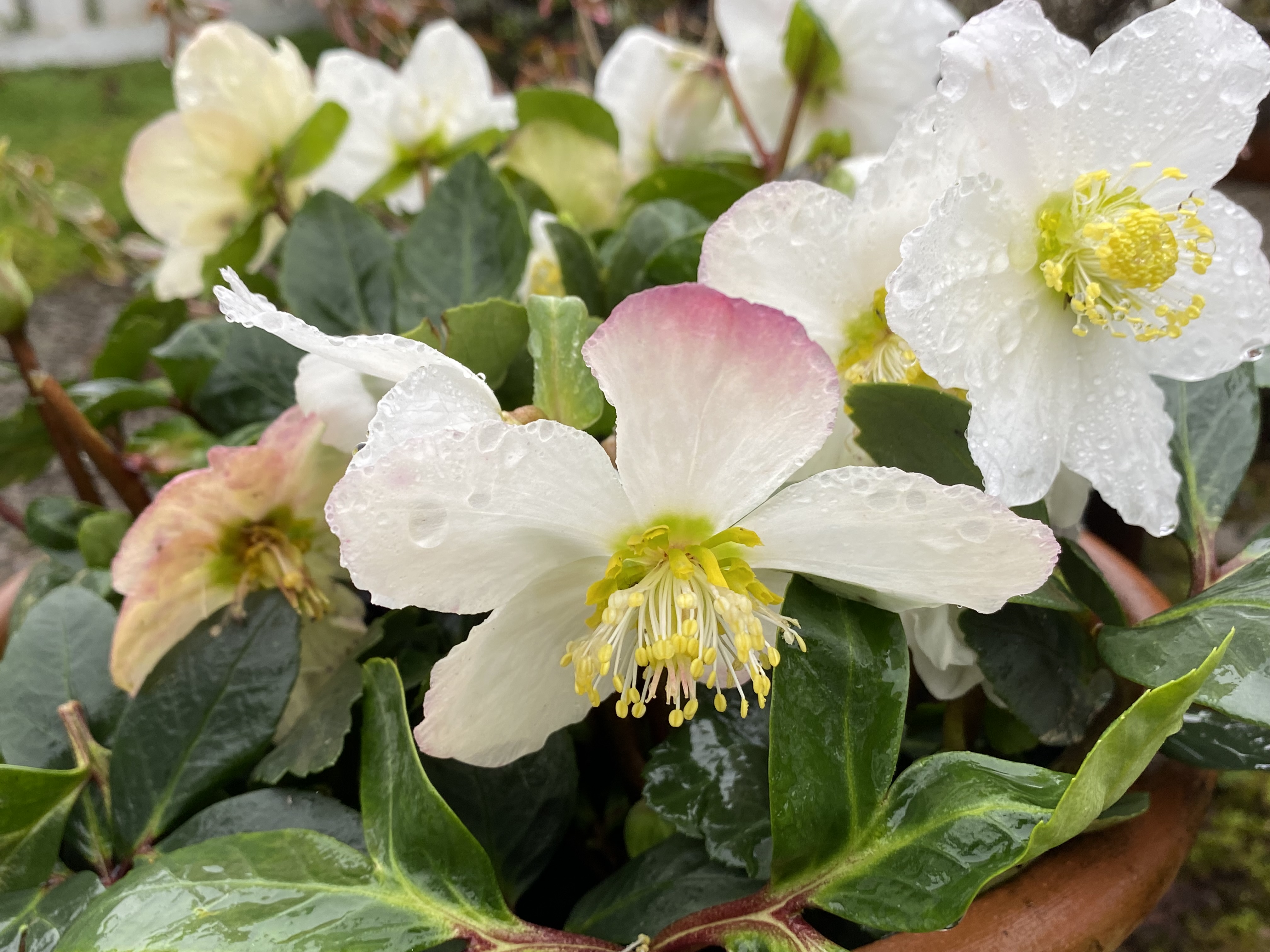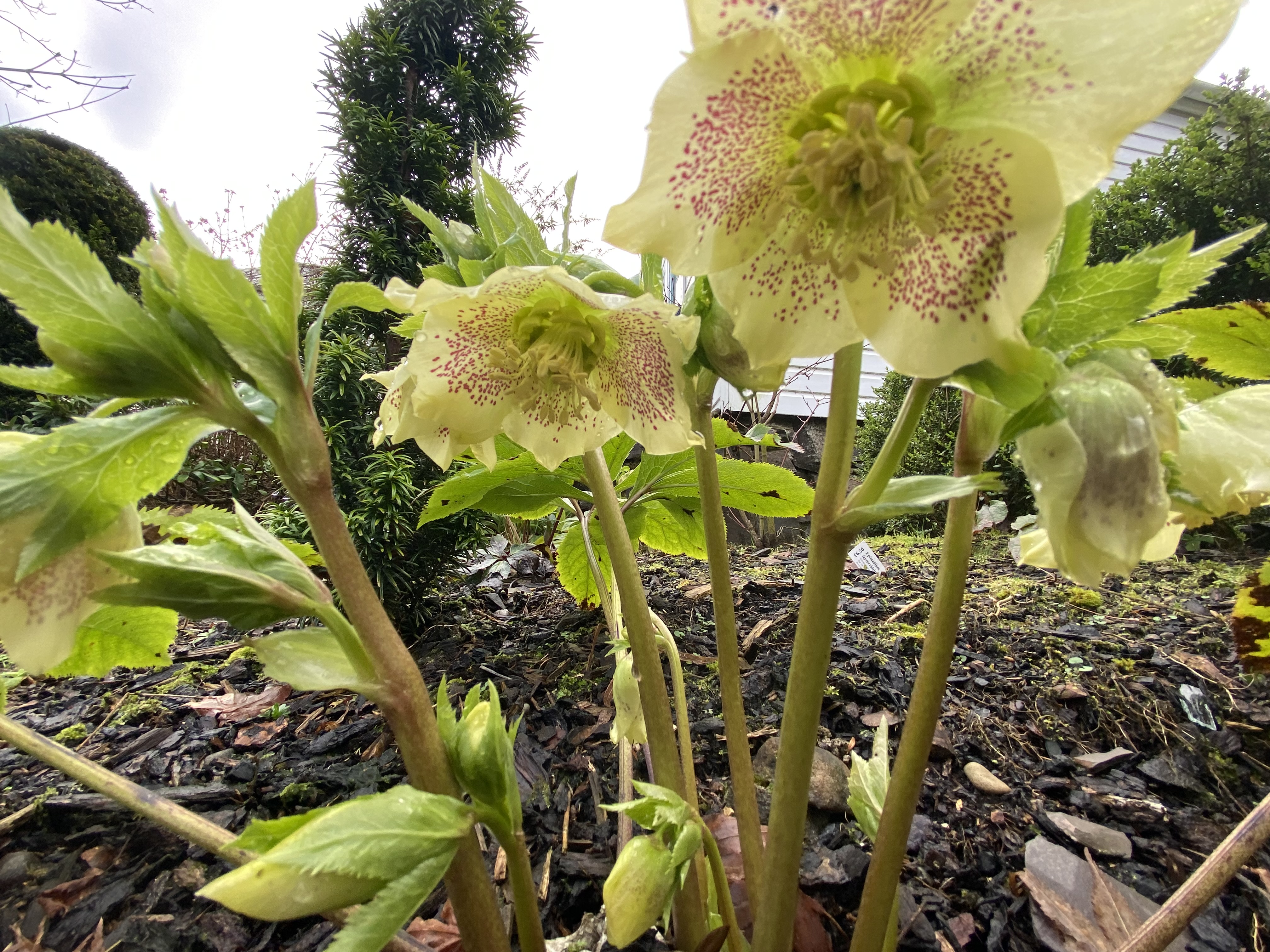 In the borders, the Hellebores advance every day with elegant flowers of white, purple and yellow. For some varieties it’s good to look at them from below, to see exquisite markings and colour patterns in the gently dipping flower heads. For others, large white flowers face up to the passer-by, as the plants nestle in the leaf mould, below the acers and birches.