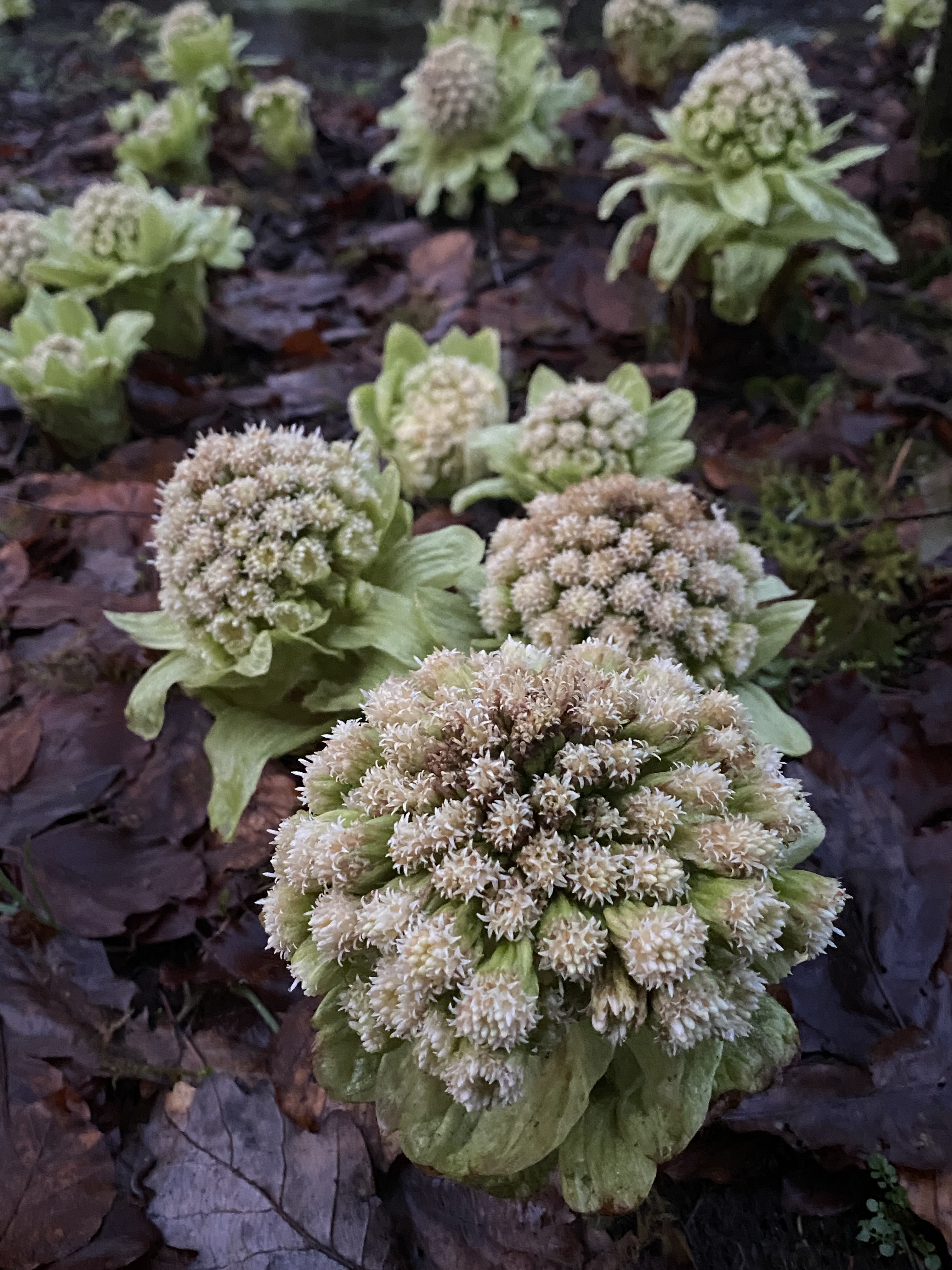 Even the solemn yew, a great favourite of mine, is confettied with its own profusion of delicate, male flower clusters that slowly fade and change into something like a miniature Brussel sprout. Meanwhile, in the bog garden, the flower heads of Butterbur or Colt’s Foot are sitting out like so many small cauliflowers. A solitary Vinca has also appeared.