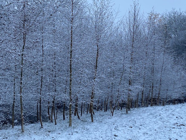 I’ve written before about planting trees in the rented field next to my home. It all began in the winter holidays of 2015-16 when I started with oak, holly, dogwood, hazel and beech in circles of varying sizes, plus 100 birches in a ‘Norwegian Wood’ along the field boundary. Later came archways of hornbeam, and a double row of Scots pines. Subsequently I’ve added single specimens of Californian Pine, Ocean Redwood, Quercus Ilex, and Cedar of Lebanon. Plus Juniper, Betula Jacquemontii, Betula Hergest, flowering silver pear and slow growing conifers – all of these in groups of three. Various attempts to establish groups of Yew, Lonicera and Fatsia have been largely unsuccessful.