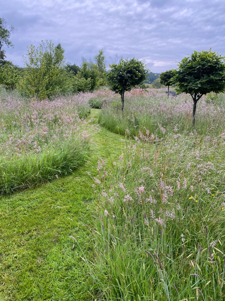 In nine years however, the growth of most things has been extraordinary. Visitors are bewildered when I reveal the young age of the oaks and pines. Most are delighted with how the circles and archways are linked together by mown paths, leaving the remaining areas, cut just once or twice in the year, to produce a profusion of wildflowers and grasses. The arboretum, with its gravelled areas, cairns and rocks provides interest throughout the year and is a fun playground for young children. I walk its paths and its turf labyrinth morning and night in all weathers, and in contemplation. It has spring bulbs, autumn colour, and beech trees pruned into cheerful mop tops. Every day it seems to offer up some new point of interest.