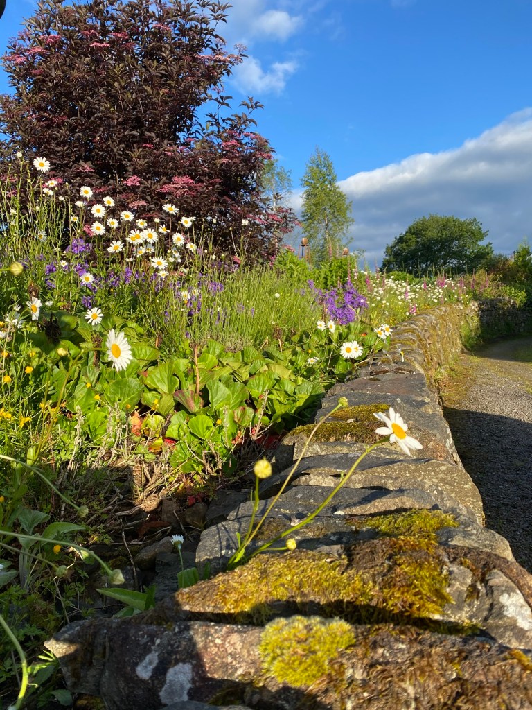 The big border that runs along the track leading to the house, catches a lot of sun. I was delighted this year to see how the oxeye daisies had spread, nicely setting off the chocolaty colour of the sambucus. Such a lovely sight when arriving home.
