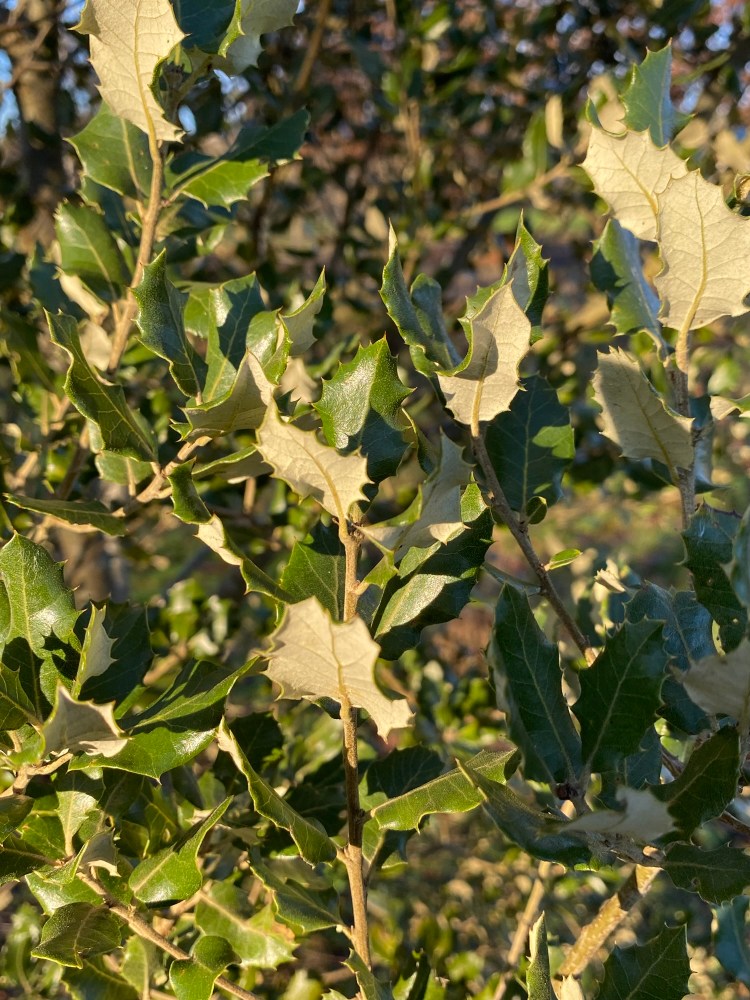 It was a fine February day in 2019 and I was on a pleasant visit to St Andrews. Sitting in the sheltered sunshine of the courtyard beside the University’s School of Divinity, I was struck by the massive tree, with it huge girth, that dominated the space. The tree was in the perfect shape of a mature oak, and yet its leaves were waxy evergreen, rather like holly. I went off in search of more detail and discovered that this magnificent specimen, said to the be the finest in Scotland, is a Holm Oak, or Quercus Ilex. Later that year, on holiday in France near Bordeaux, I came across another example of the same tree in the grounds of a ruined abbey. Here it seemed totally at home in the hot afternoon, wonderfully shaped and with a mass of dusty-green foliage.
