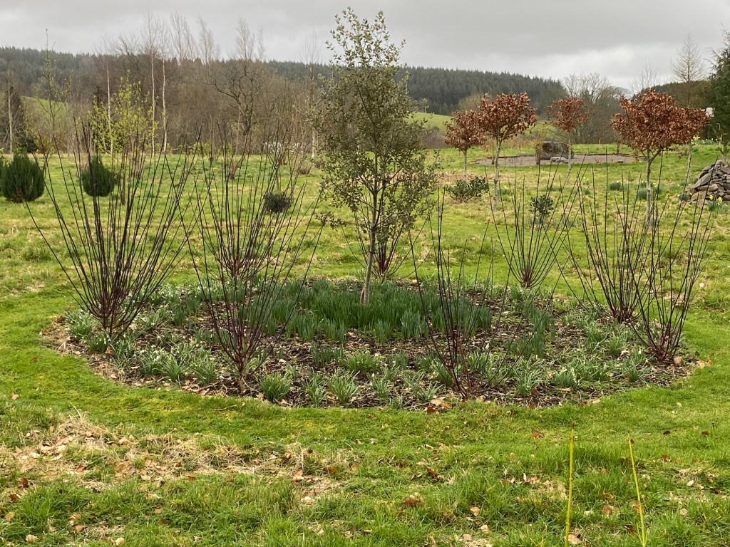 When I got home, I quickly looked up the tree again, and despite reference to its Mediterranean origins, I ordered a small specimen, about 3 feet tall, growing in a pot. I duly planted it in the middle of a circle of dark dogwoods and hoped for the best. How would it fare in our mild, wet region – so different to the Gironde or indeed to Fife. In the intervening years, I have been delighted to see my Quercus Ilex rebut wind, rain, snow and frost and make steady progress. Not yet a specimen tree in the conventional sense, and photographs still don’t quite do it justice, but the Holm Oak, first brought to Britain around 1500, is among my favourite trees in the Dumfriesshire Garden. It is now about 8 or 9 feet tall and puts on healthy growth each year. Looking at the pictures here, I should perhaps try to improve the staking. Beyond that it is left to its own devices and brings forth my fond admiration when I look at it each day. It has also nicely solved the ‘Q’ problem in this A-Z of the garden in 2024!