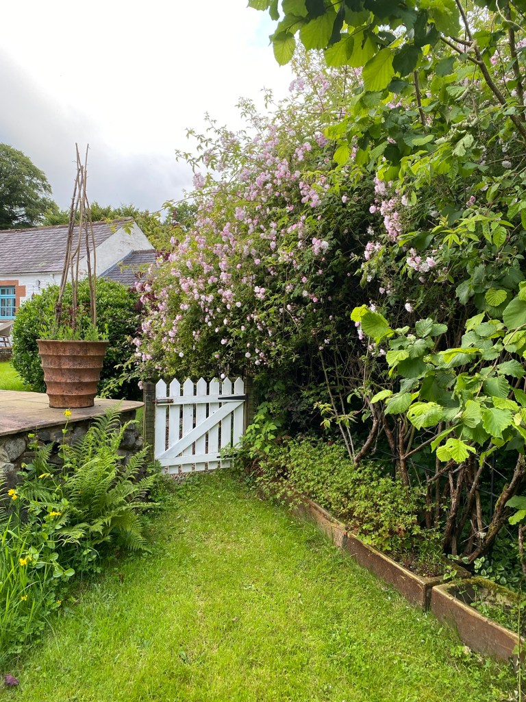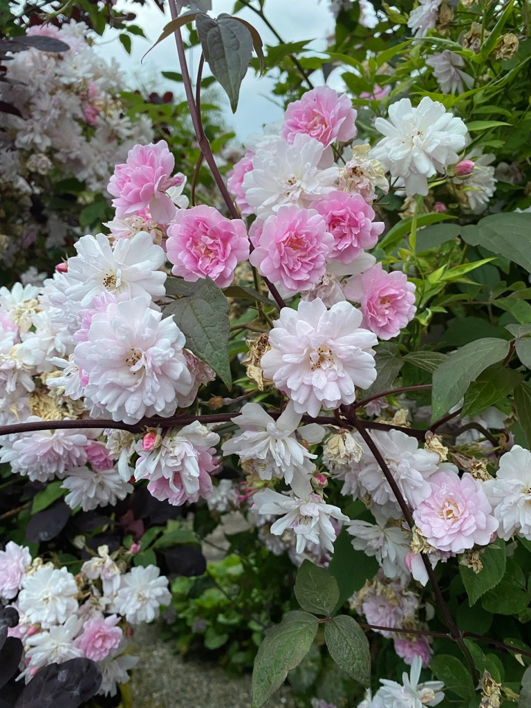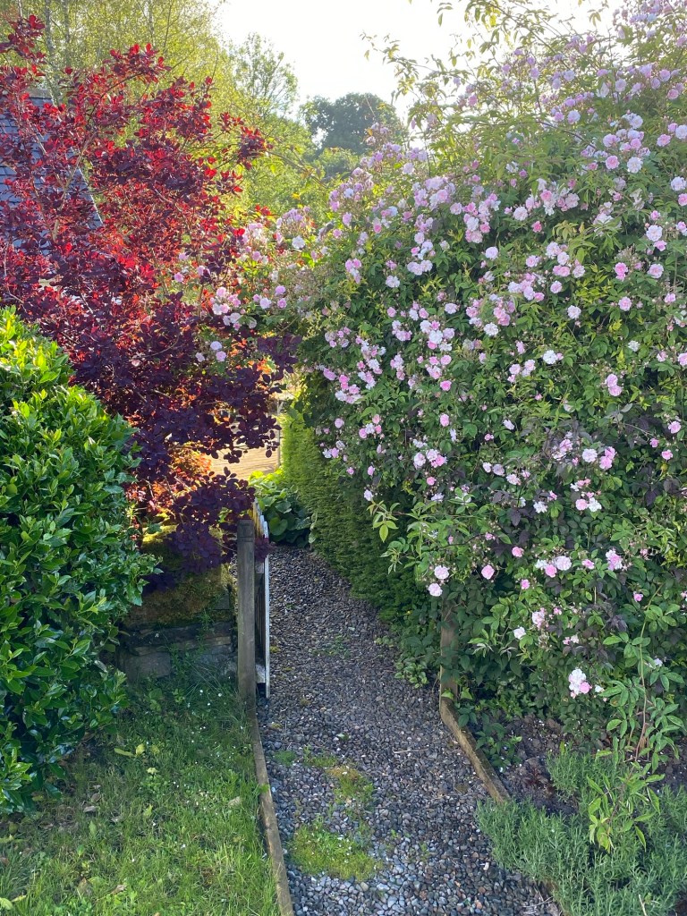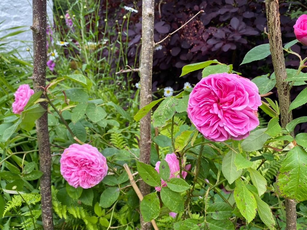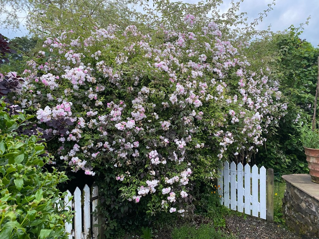 Roses are not my specialty. But they are nevertheless essential to most gardens. In the Dumfriesshire Garden the big rose feature is the rambler on the metal arch. We try to tidy it up every winter as it seems to get more and more unruly. But the effect can be fantastic. It’s had a really good year in 2024, as can be seen here, and with extended flowering,