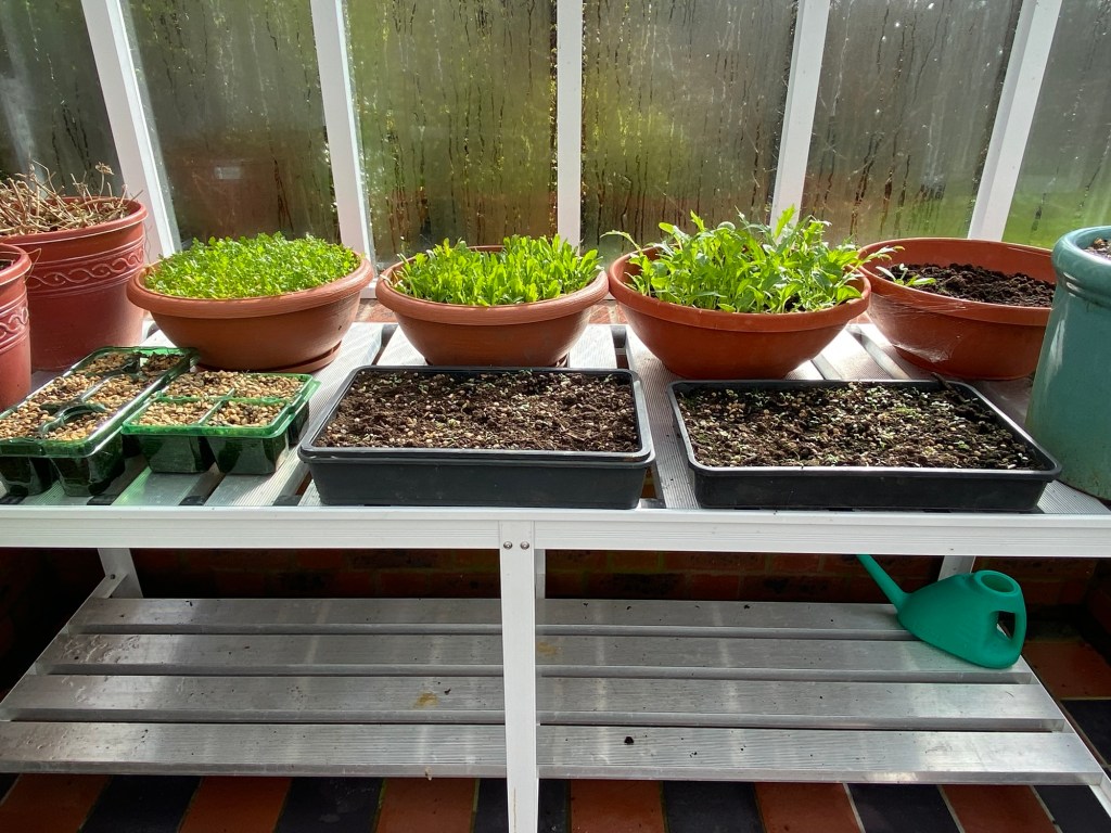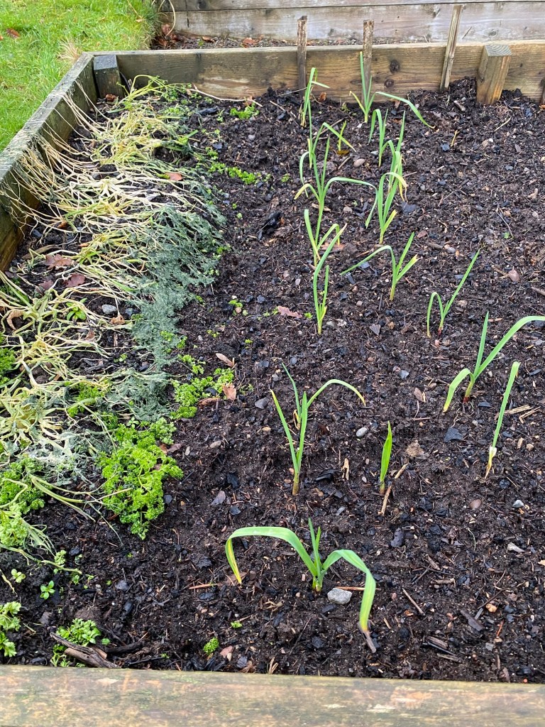 I like to grow early salads in bowls in the greenhouse, moving on to herbs like dill and coriander when the weather gets warmer. Then I plant out red and green pick-and-come-again varieties of lettuce, followed later by the hearting varieties. all of these started off in the greenhouse. For more than six months of the year it’s possible to ignore the salad section in the supermarket. We have parsley all year round, under glass and outdoors, though this year a nasty frost in November put paid to a lovely row of that all-round useful herb. It can be seen in the pictures below, flattened next to the first sproutings of garlic.