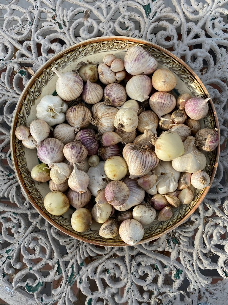 In 2023 the garlic crop was exceptional and saw us through to harvesting in late June this year. But the 2024 crop was meagre by comparison. The bulbs were small in general and in some cases did not subdivide into cloves. Come planting time this year I bought in fresh seed stock and am hoping for better results in 2025.