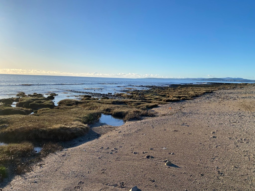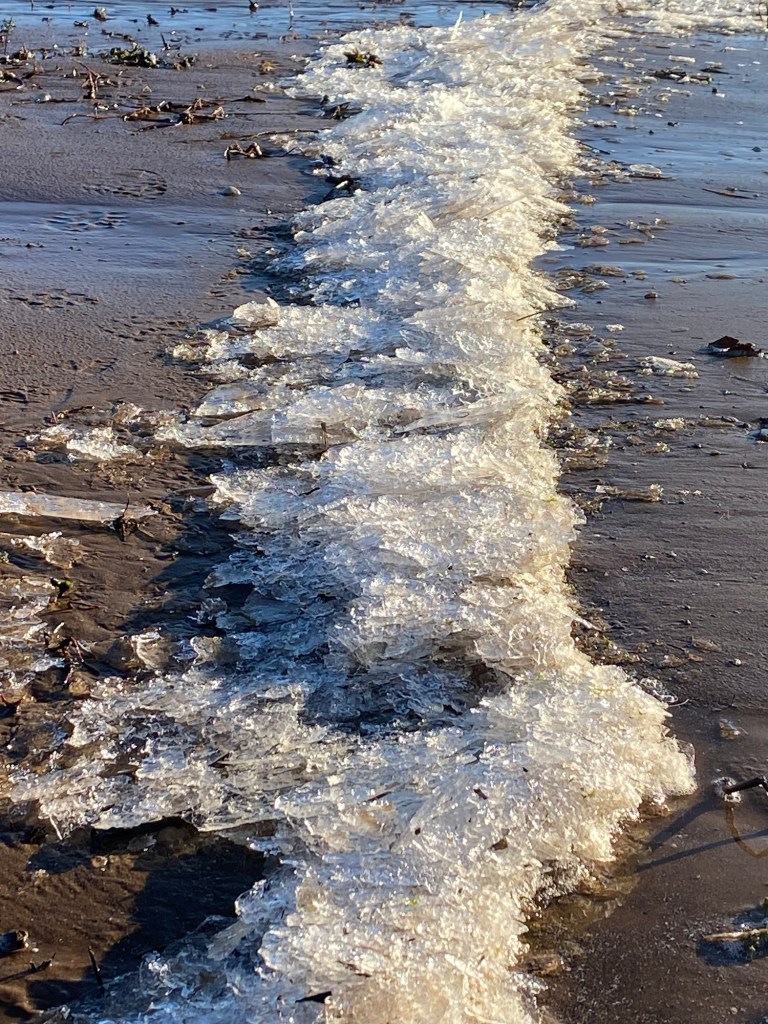Now the sun is dipping lower over the retreating Solway tide, losing its warmth. We stand and look across to the Lakeland fells. The chill is settling in. At the water’s edge we spot a thick tide mark of ice crystals.