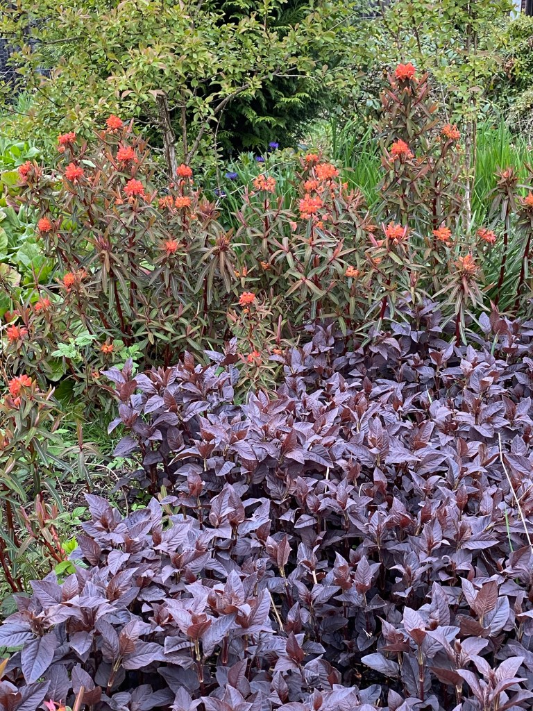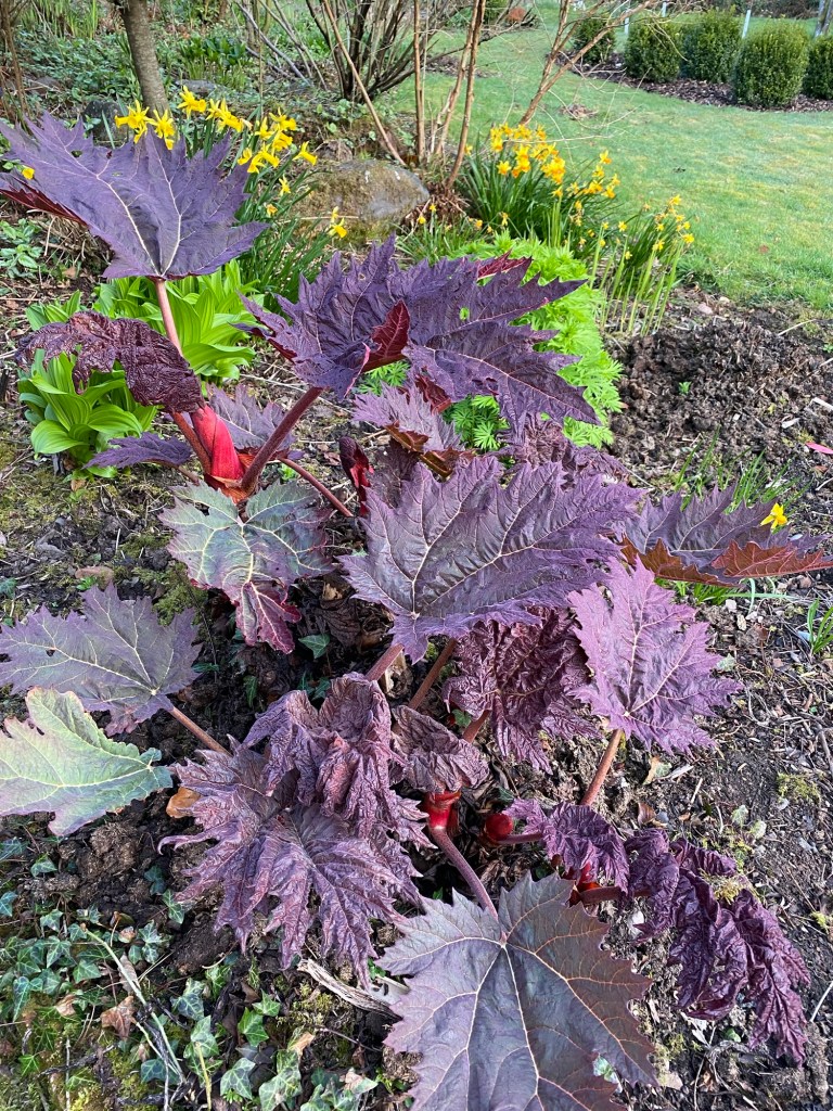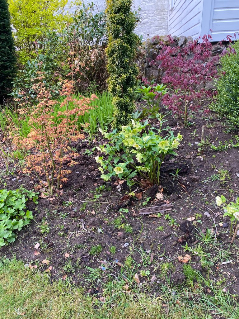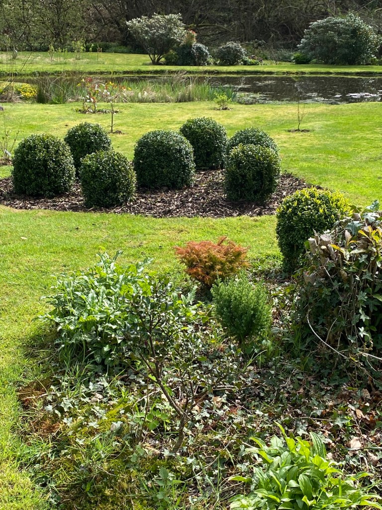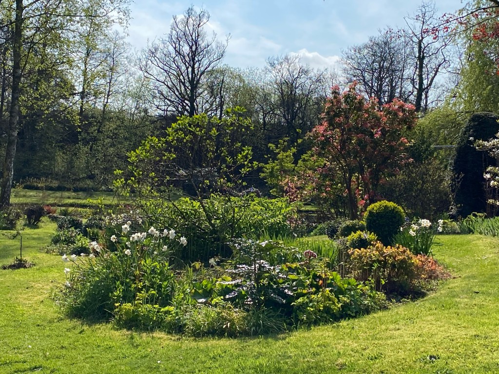 Back in my own terroir, with its open borders and borrowed landscape, there is much to enjoy as the month advances. This April has brought a halting and then gradual acceleration of growth in the garden. My favourite examples in this regard make up a long list, from acers to viburnums. Acid greens of euphorbia stand boldly against the green spikes of yucca and mahonia. Fattening pink buds of clematis are on the point of flowering. Magnolia has shone white and now gone past its peak. Around the boggy borders mass activity is underway among the rheums, ligularia, meconposis, primulas, marsh marigold and darmera. In drier spots, the hellebores and epimediums just keep on giving, as along come the later flowering narcissi. In the gravelly front garden, alpines kick into high gear and forget-me-not wanders wantonly, wherever it can. Under a canopy of maple and pieris japonica, uvularia and trillium emerge from the mulchy ground. Elsewhere, the blowsy Great Dixter euphorbia stands orange-red against a coppery foreground. The newly transferred box get their Spring trim, whilst the labyrinth and arboretum paths have their first of the year encounter with the mower. The images below, tell the story.