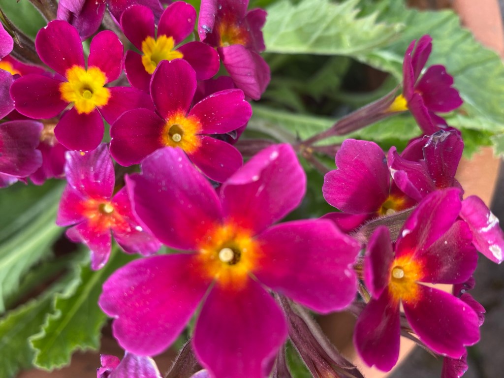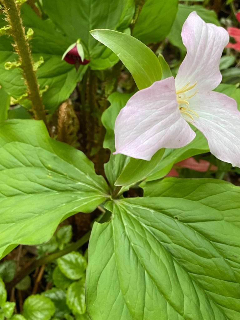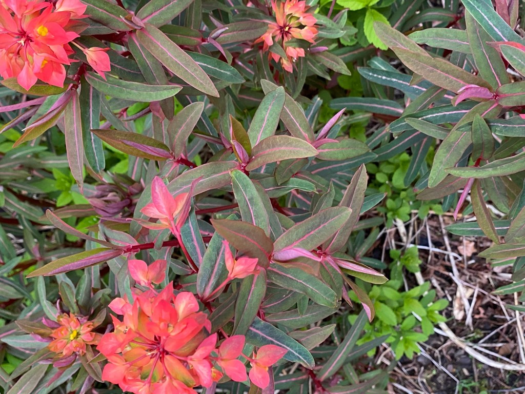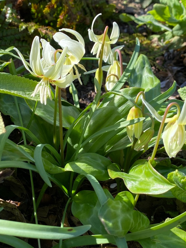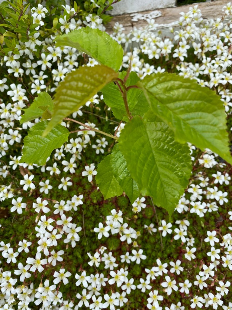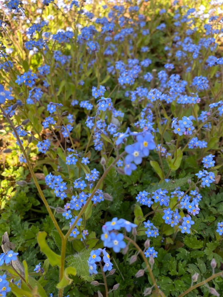 Back in my own terroir, with its open borders and borrowed landscape, there is much to enjoy as the month advances. This April has brought a halting and then gradual acceleration of growth in the garden. My favourite examples in this regard make up a long list, from acers to viburnums. Acid greens of euphorbia stand boldly against the green spikes of yucca and mahonia. Fattening pink buds of clematis are on the point of flowering. Magnolia has shone white and now gone past its peak. Around the boggy borders mass activity is underway among the rheums, ligularia, meconposis, primulas, marsh marigold and darmera. In drier spots, the hellebores and epimediums just keep on giving, as along come the later flowering narcissi. In the gravelly front garden, alpines kick into high gear and forget-me-not wanders wantonly, wherever it can. Under a canopy of maple and pieris japonica, uvularia and trillium emerge from the mulchy ground. Elsewhere, the blowsy Great Dixter euphorbia stands orange-red against a coppery foreground. The newly transferred box get their Spring trim, whilst the labyrinth and arboretum paths have their first of the year encounter with the mower. The images below, tell the story.
