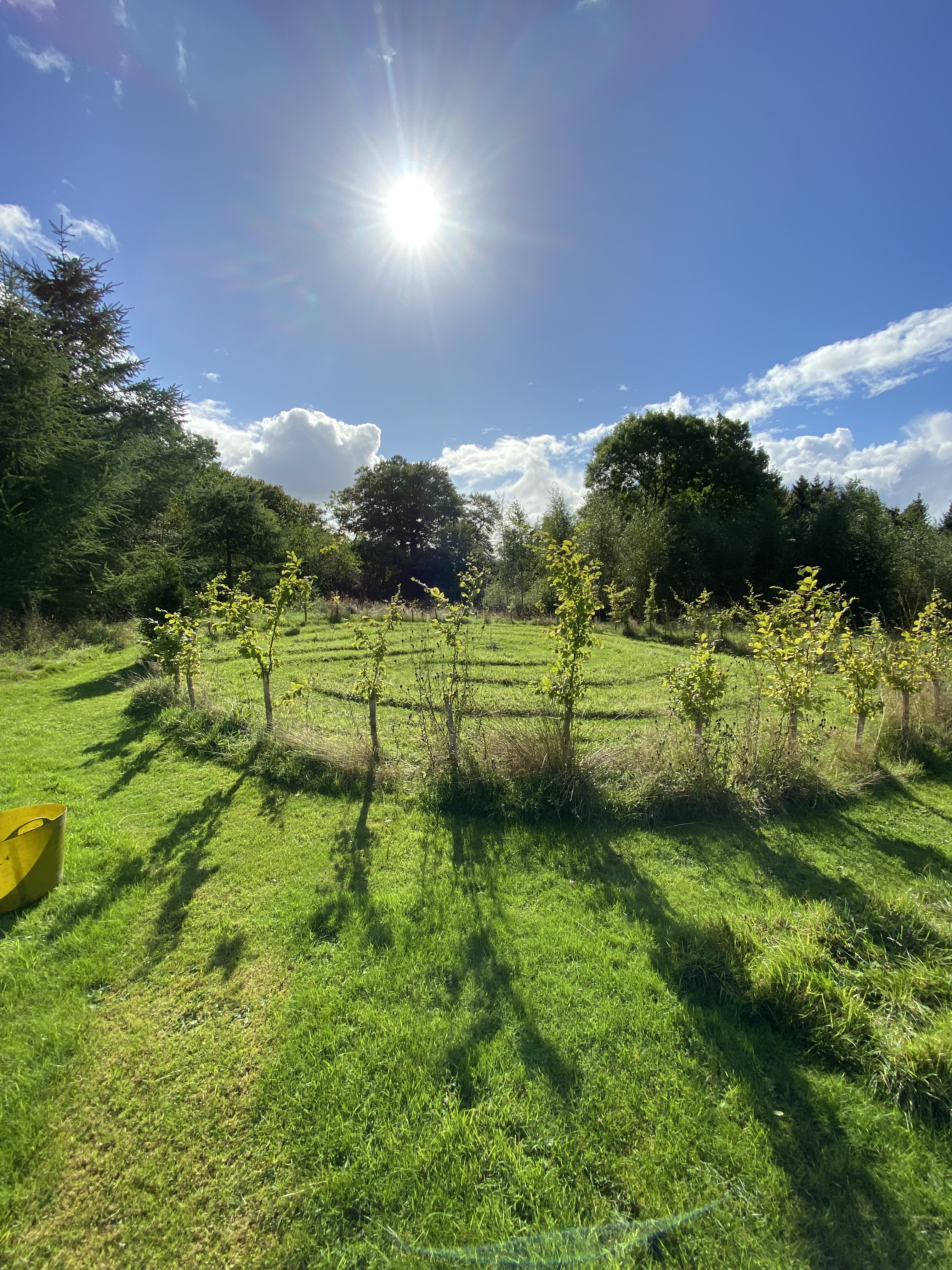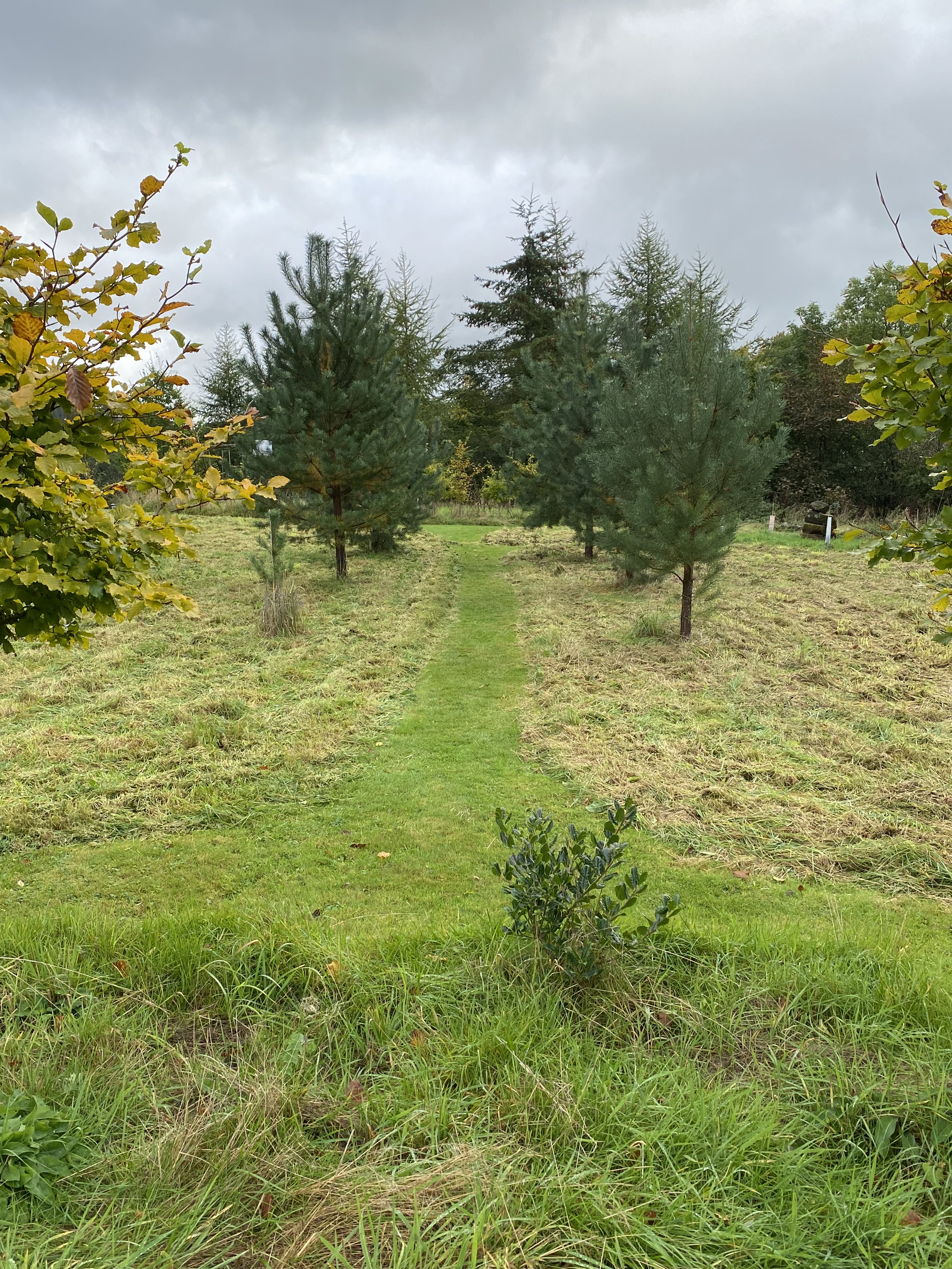 Since I took a lease on the field next to my house in 2015, I have developed a couple of acres of rough pasture into something that gives endless pleasure and satisfaction. A veritable arboretum, the field is now home to over two hundred trees and woody shrubs. A block of silver birch runs the entire length of one side, elsewhere there is planting of oak, beech, dogwood, hornbeam and hazel, in circles linked together by mown paths. Dotted throughout are single specimens of cedar, redwood, and holm oak, as well as small groups of special interest, such as rowan, prickly pear, and red oak. In addition to these, I have created hedges, arboreal archways, tree lined paths and a turf labyrinth.