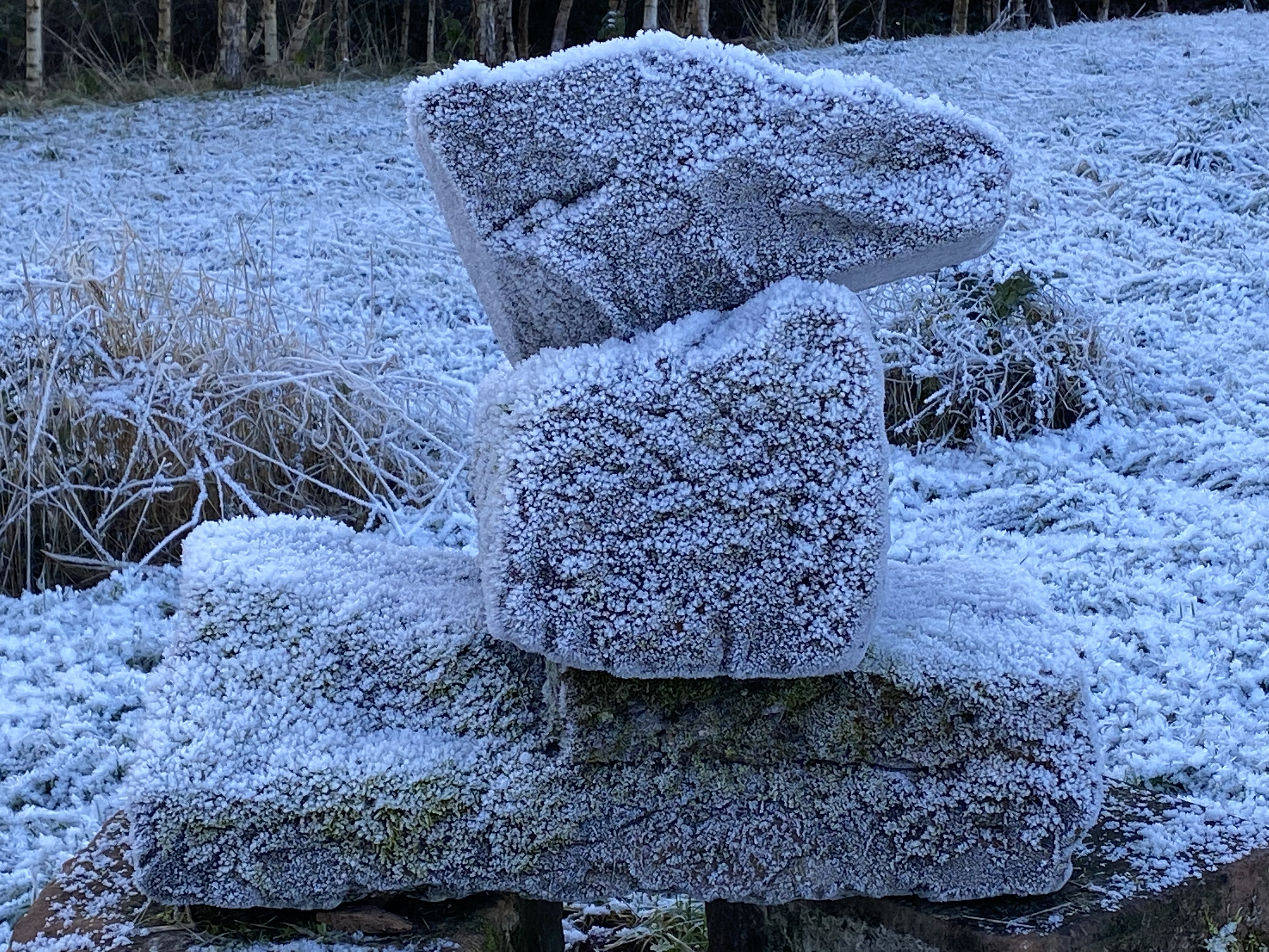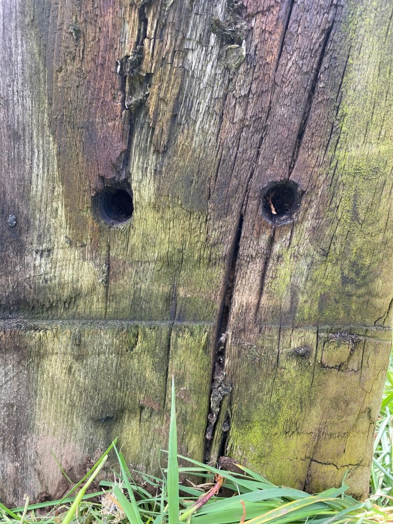It was during a gallery tour of Borba’s exhibition that one of the group members talked about the tall wooden posts, remnants of old fencing, that dot the landscape around her home near Leadhills, showing us photographs of some striking examples. I thus found a link between the skilled and wonderfully detailed work of the sculptor, and the agentic effects of time and weather on objects in the landscape. Only a few days later I ‘unearthed’ my three sleepers from under a pile of leaves and thought about how they would look standing up in the field. Seizing the moment, plus a spade and wheelbarrow, I went ahead immediately. I was also delighted, on close examination to find on each of the sleepers a rich array of markings, drilled holes, weathering and de-composition. Characteristics of which I feel sure Borba would approve.