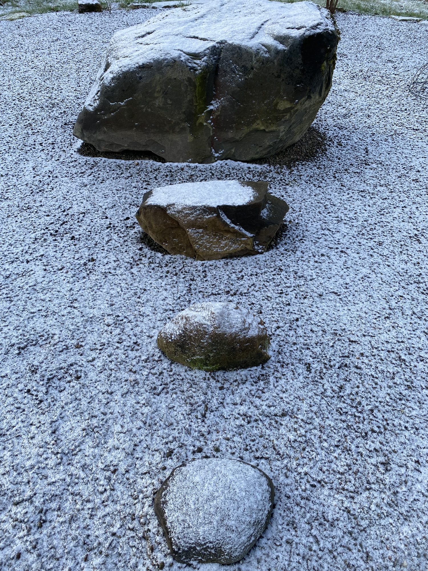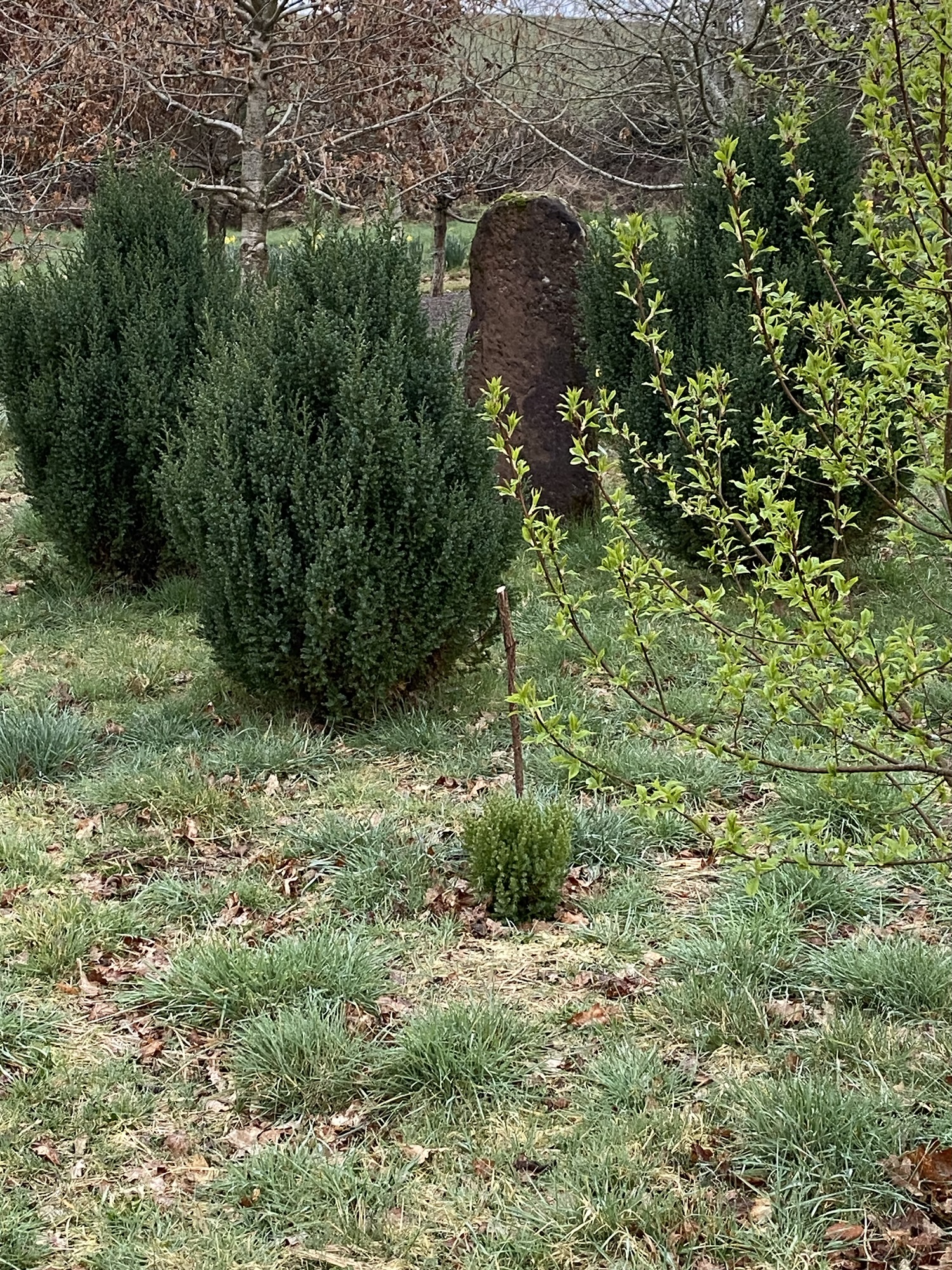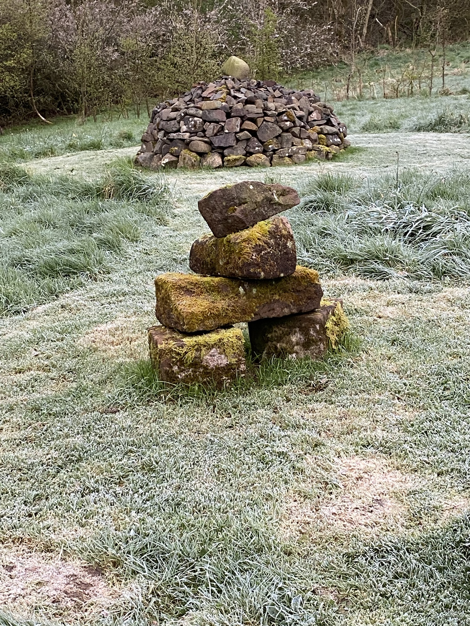 It’s a place to let the imagination run free, and this has extended to inanimate objects like groups of large rocks and a couple of cairns, the larger one of which has had a screen of hornbeam planted round it this winter. There are constructions of precariously balanced large rocks, and also a couple of stone campfire circles. A few years ago I also installed a large sandstone gatepost, inscribed with some words from the anchorite Julian of Norwich: all shall be well.