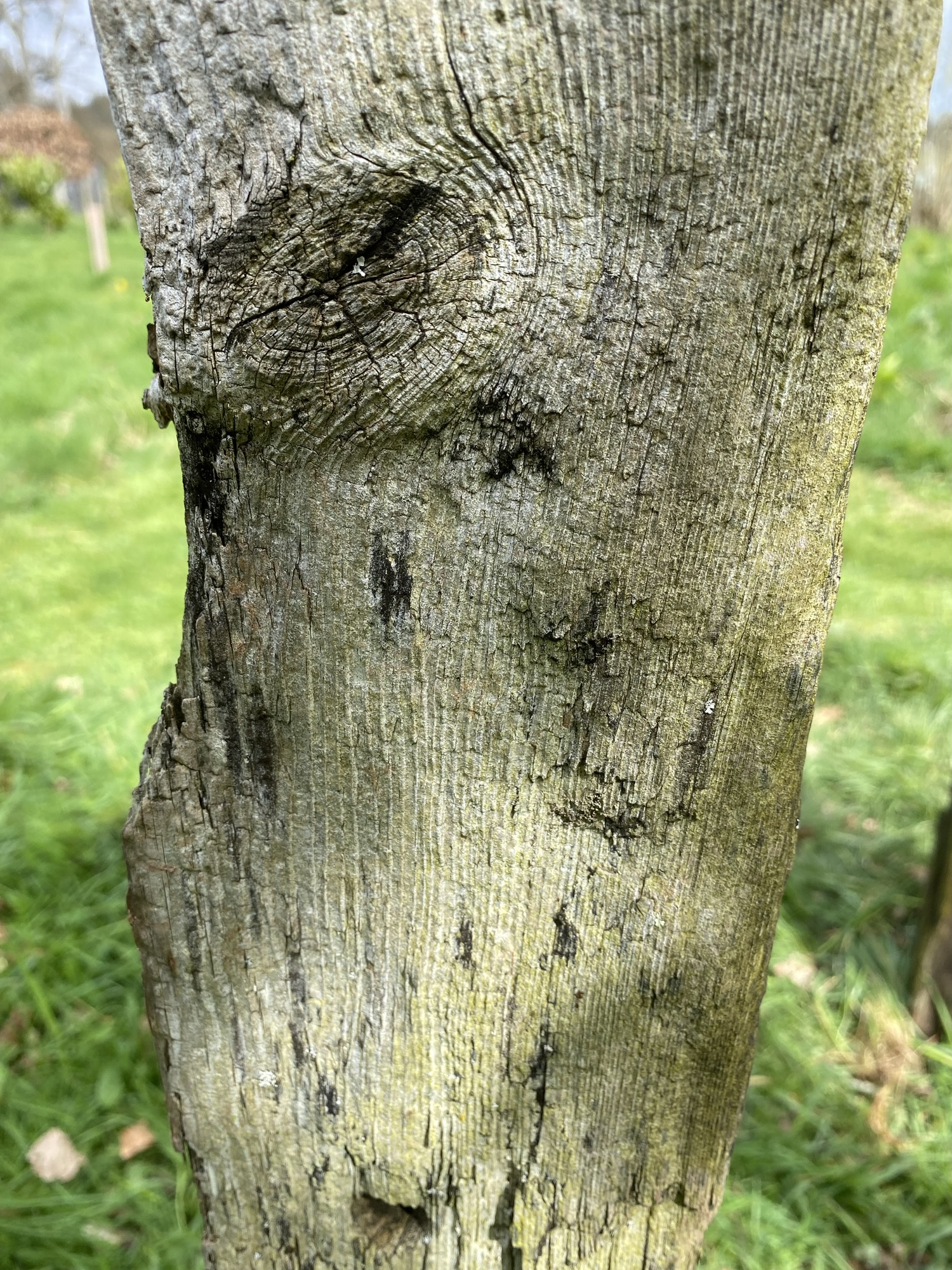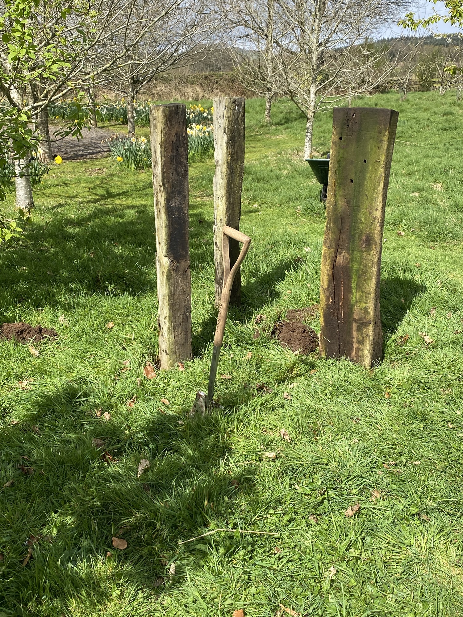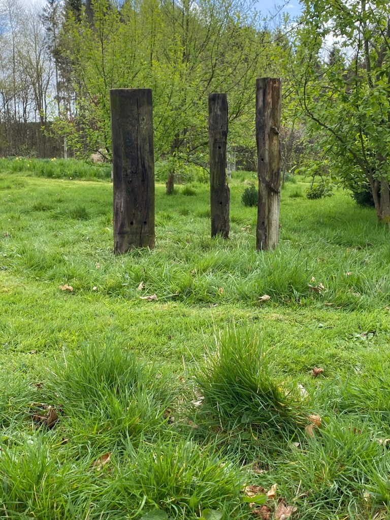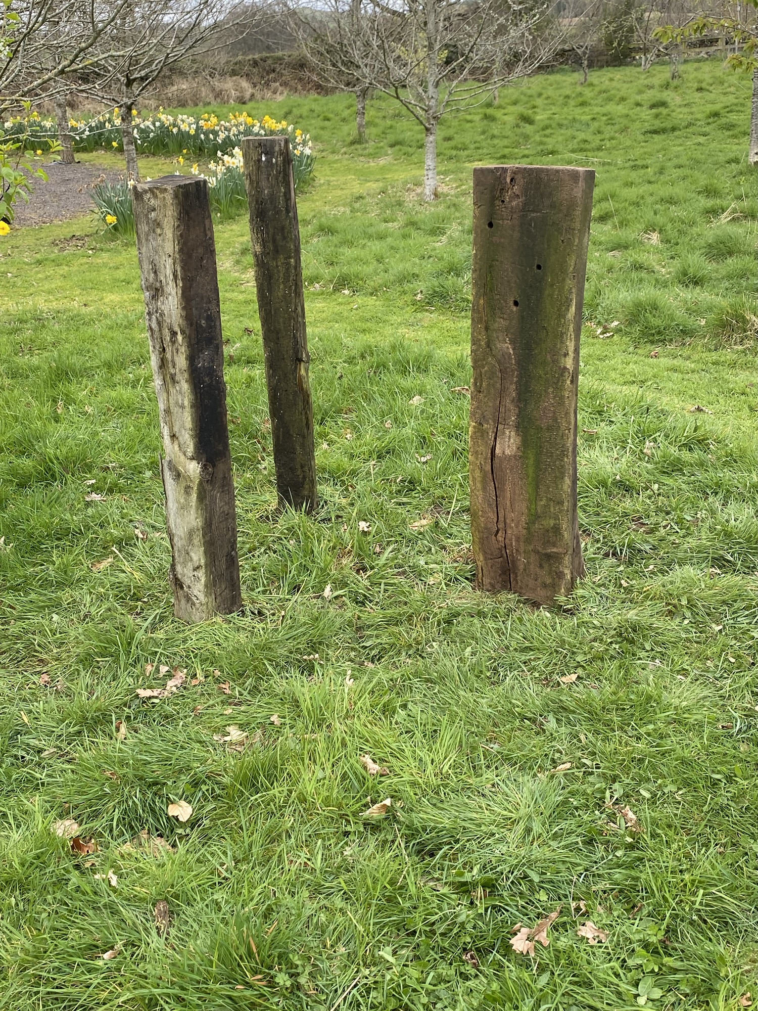 For reasons that will soon become clear, I suddenly realised that these three pieces of weathered, textured, drilled, and mossed timber might have potential for a garden installation. On a dry and intermittently sunny April morning, I therefore spent some time choosing a location for the idea, and eventually settled on a spot among wild cherry trees and close to the sandstone gatepost.