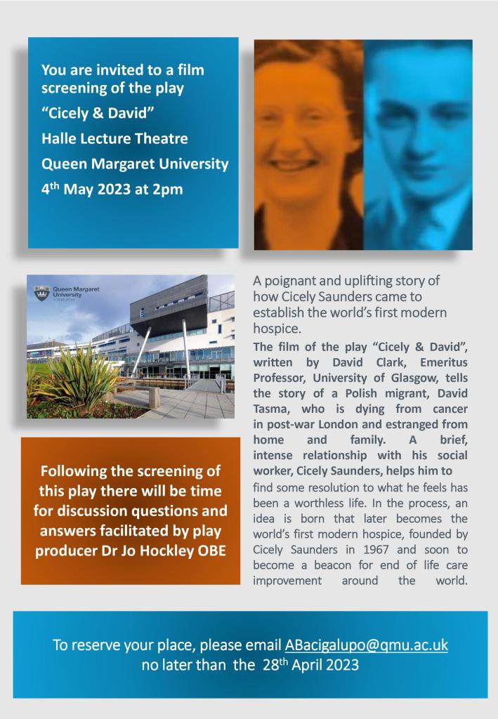 Dr Erna Haraldsdottir writes: ‘About 40 people, mostly students in nursing, drama and occupational therapy, came to a showing of the film “Cicely and David” at Queen Margaret University (QMU) on 4th May 2023. Four of the cast/directors/crew were there alongside Jo Hockley (producer) to discuss aspects about palliative and end of life care, which stimulated a lively and honest conversation with people telling their own moving stories after the film. Students found the play “extremely moving” and “very real”. It was evident how the film was enlightening in terms of what are the needs of those who are dying: “I realise now often dying people just need comforting”; “I was struck by the focus on what matters; it is not just time … it’s about the quality of time”; “I am wondering about ‘secret grief’ that staff may suffer when caring for dying people” It was also striking how real the story was to the audience and some felt a strong emotional connection with David Tasma himself ….. “did Professor Clark ever find out what happened to his family?”’