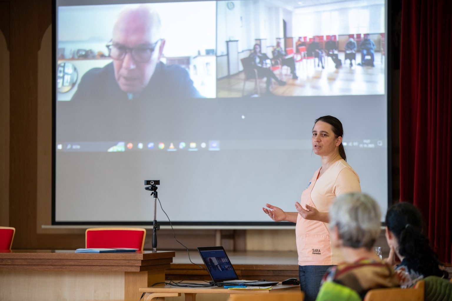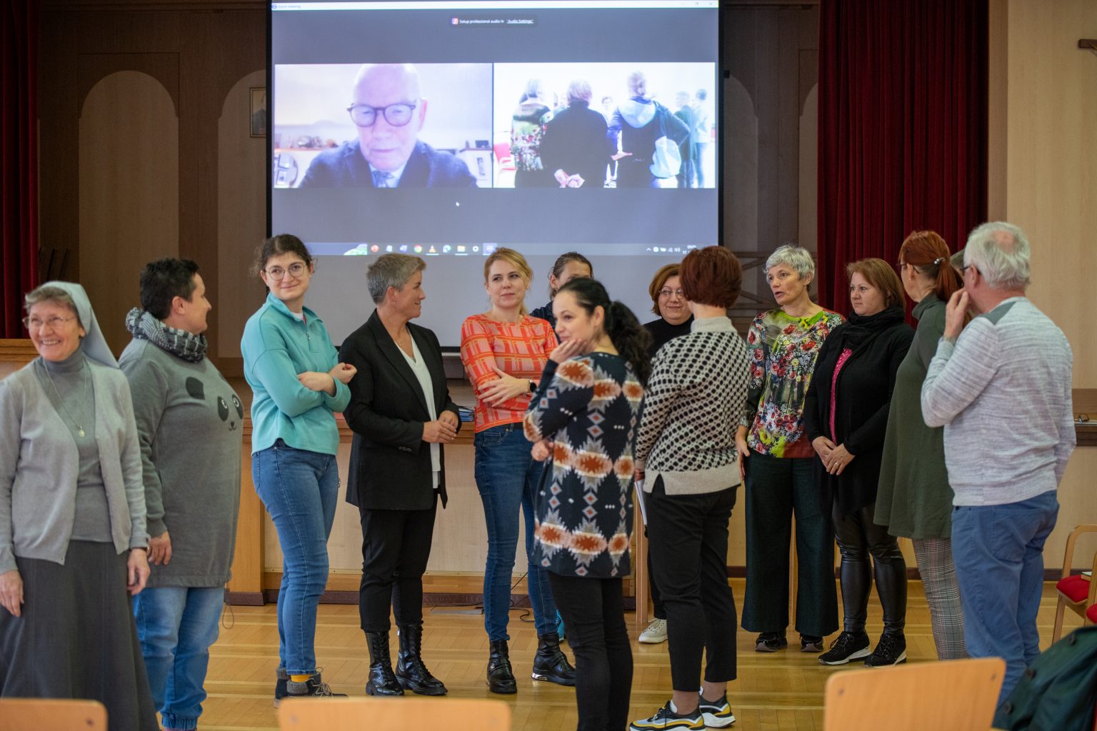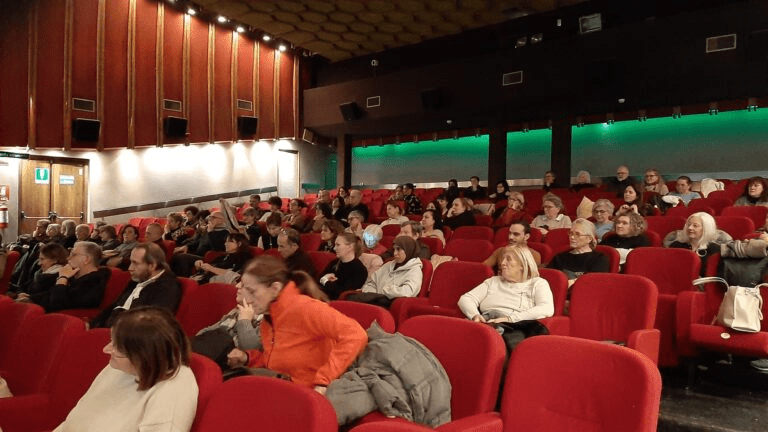 In a big auditorium of Fondazione Cardinal Gusmini, in a sunny day up in the Seriana Valley, over Bergamo city, a close-knit group of volunteers of the Hospice of Vertova, plus the hospice director Dr. Margherita Zambetti, the Head of Volunteers Silvana Messina, and other members of the team, followed with interest the screening of the play, and then we talked about it and how artistic performances are so meaningful in caring.