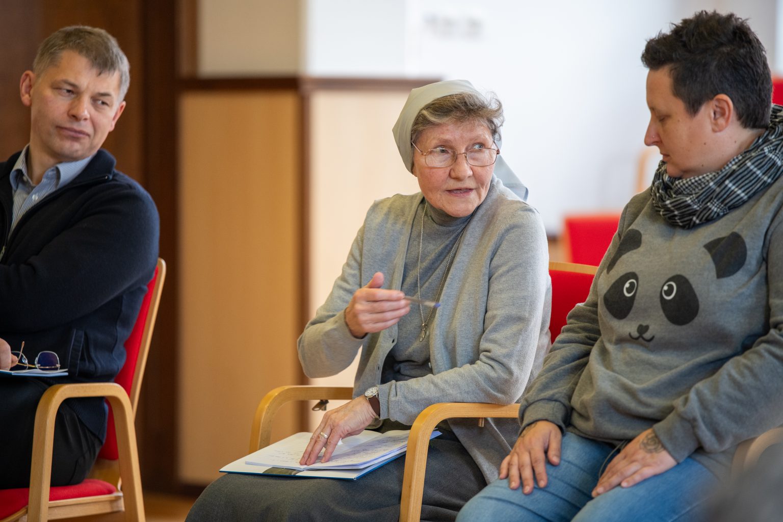 However, the questions weren’t necessary, the play was very moving in its own right. There were moments of laughter, but also moments of great emotion among our colleagues. At the end of the play we shared our emotions freely in small groups. There was laughter, tears and also some hugs.