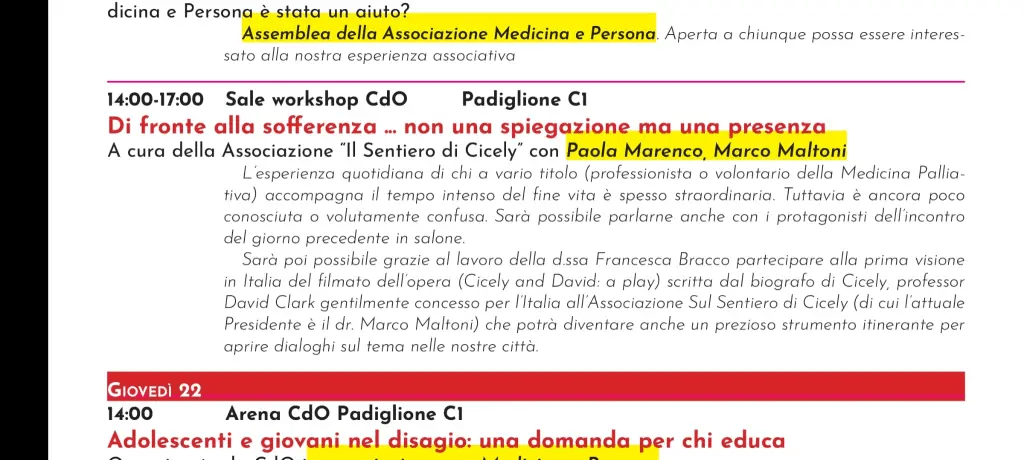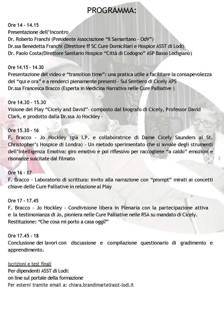 ‘We had the first screening on Friday afternoon from 2 till 6 p.m. with nurses and OSS (social sanitary operators) plus the coordinator of the hospice. We really shared emotions, thoughts and experiences in hospice life with patients and their families, starting from watching the play and then using narrative medicine methods to highlight keywords and key concepts in palliative care, inspired by the the work of Cicely Saunders. We had a prompt for writing and some time to share the results, in a gentle, free of judgment atmosphere and with maximum participation. I was delighted to hear at the end, how positive the experience was, for re-motivation, for remembering how delicate, important and meaningful the multidisciplinary team is, and what a privilege it is to be at the bedside of dying people, and simply to “stay”. The spiritual care guido of Sul Sentiero di Cicely, is Dr. Miccinesi, who also came to share in the sessions with us.