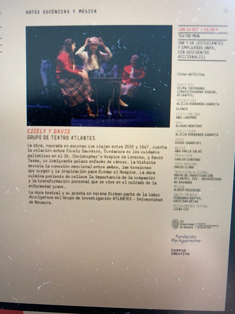 25th March 2025: A screening of the Spanish production of Cicely y David, hosted the ATLANTES Global Observatory of Palliative Care took place the Science Building of the University of Navarra. Since its premiere in 2024, at the Civivox theatre in Pamplona, the play, featuring doctors, nurses and researchers from the ATLANTES group and the Clínica of the University of Navarra, has been successfully performed before more than 2,000 people in Pamplona, Cartagena de Indias, and in Málaga. For a superb trailer to the film of the play, take a look: aquí.