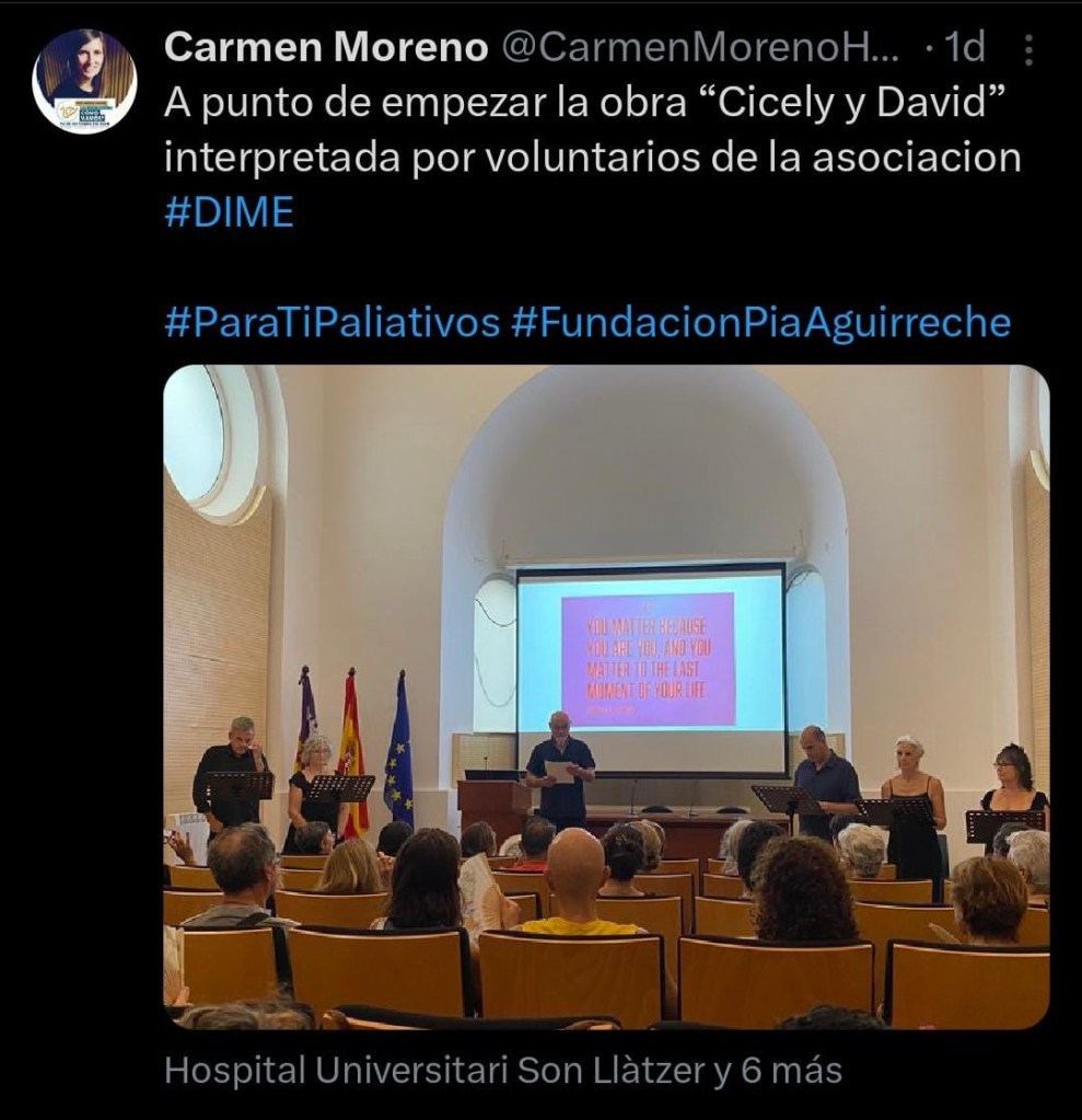 Thanks to the initiative of DIME PALIATIVOS, the Palliative Care Volunteers Association of the Balearic Islands and a long-standing and committed organization working in partnership with the public health system (Ib-Salut) across several hospitals, staged a reading of the Spanish version of the play in the Joan March Hospital. The director of the production and the actors are volunteers from the association.